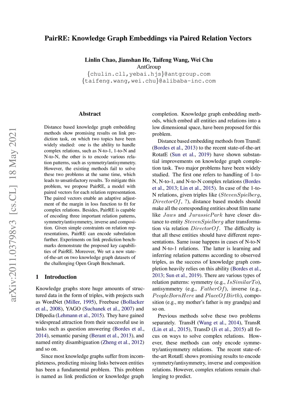 PairRE: Knowledge Graph Embeddings via Paired Relation Vectors