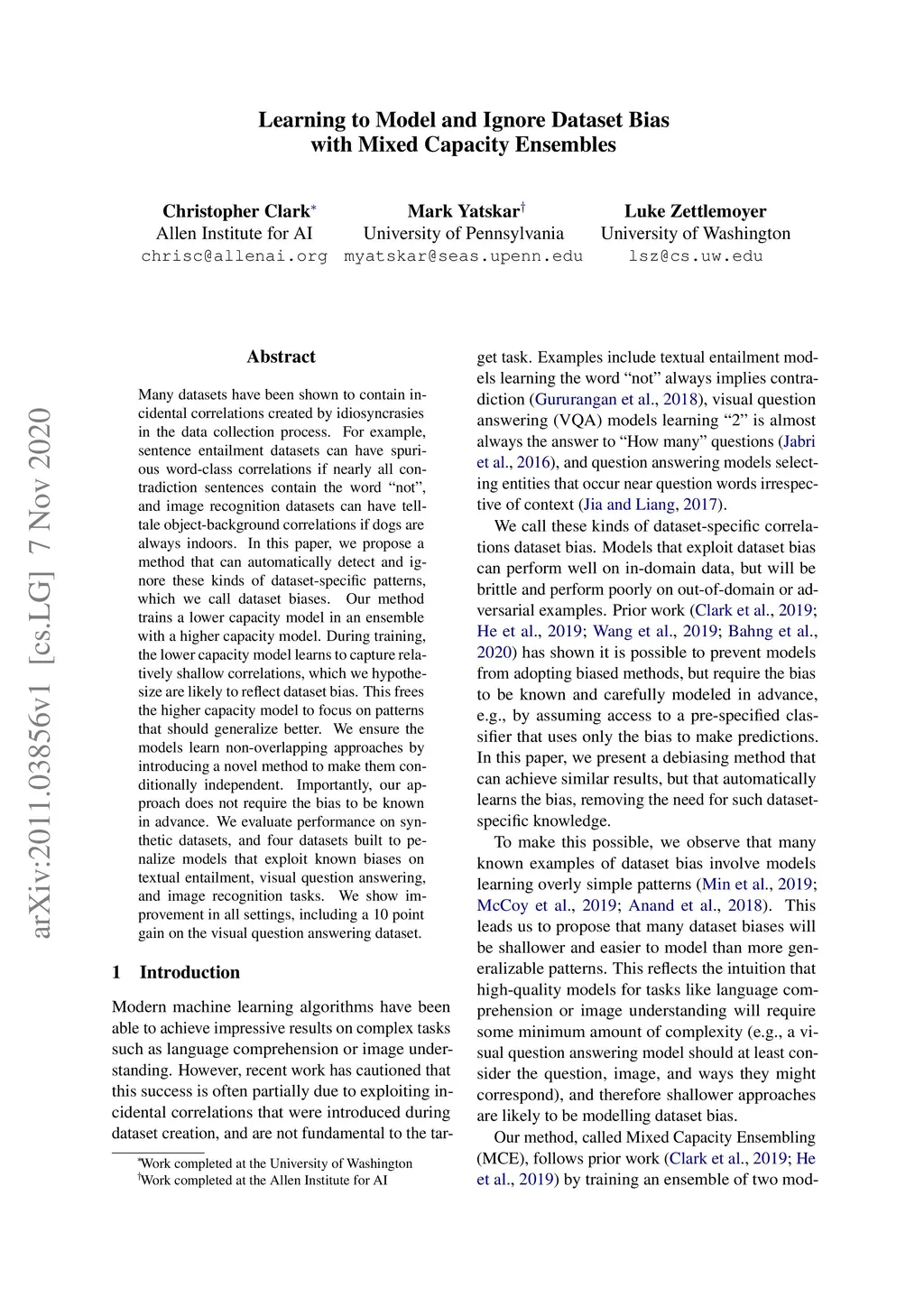 Learning to Model and Ignore Dataset Bias with Mixed Capacity Ensembles