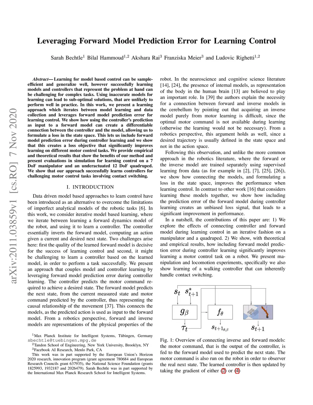 Learning for model based control can be sample-efficient and generalize well, however successfully learning models and controllers that represent the problem at hand can be challenging for complex tasks. Using inaccurate models for learning can lead to sub-optimal solutions, that are unlikely to perform well in practice. In this work, we present a learning approach which iterates between model learning and data collection and leverages forward model prediction error for learning control. We show how using the controller's prediction as input to a forward model can create a differentiable connection between the controller and the model, allowing us to formulate a loss in the state space. This lets us include forward model prediction error during controller learning and we show that this creates a loss objective that significantly improves learning on different motor control tasks. We provide empirical and theoretical results that show the benefits of our method and present evaluations in simulation for learning control on a 7 DoF manipulator and an underactuated 12 DoF quadruped. We show that our approach successfully learns controllers for challenging motor control tasks involving contact switching.