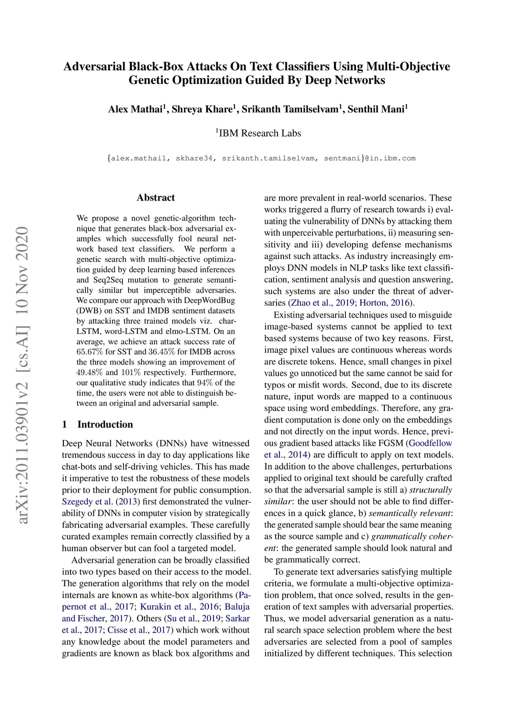 We propose a novel genetic-algorithm technique that generates black-box adversarial examples which successfully fool neural network based text classifiers. We perform a genetic search with multi-objective optimization guided by deep learning based inferences and Seq2Seq mutation to generate semantically similar but imperceptible adversaries. We compare our approach with DeepWordBug (DWB) on SST and IMDB sentiment datasets by attacking three trained models viz. char-LSTM, word-LSTM and elmo-LSTM. On an average, we achieve an attack success rate of 65.67% for SST and 36.45% for IMDB across the three models showing an improvement of 49.48% and 101% respectively. Furthermore, our qualitative study indicates that 94% of the time, the users were not able to distinguish between an original and adversarial sample.