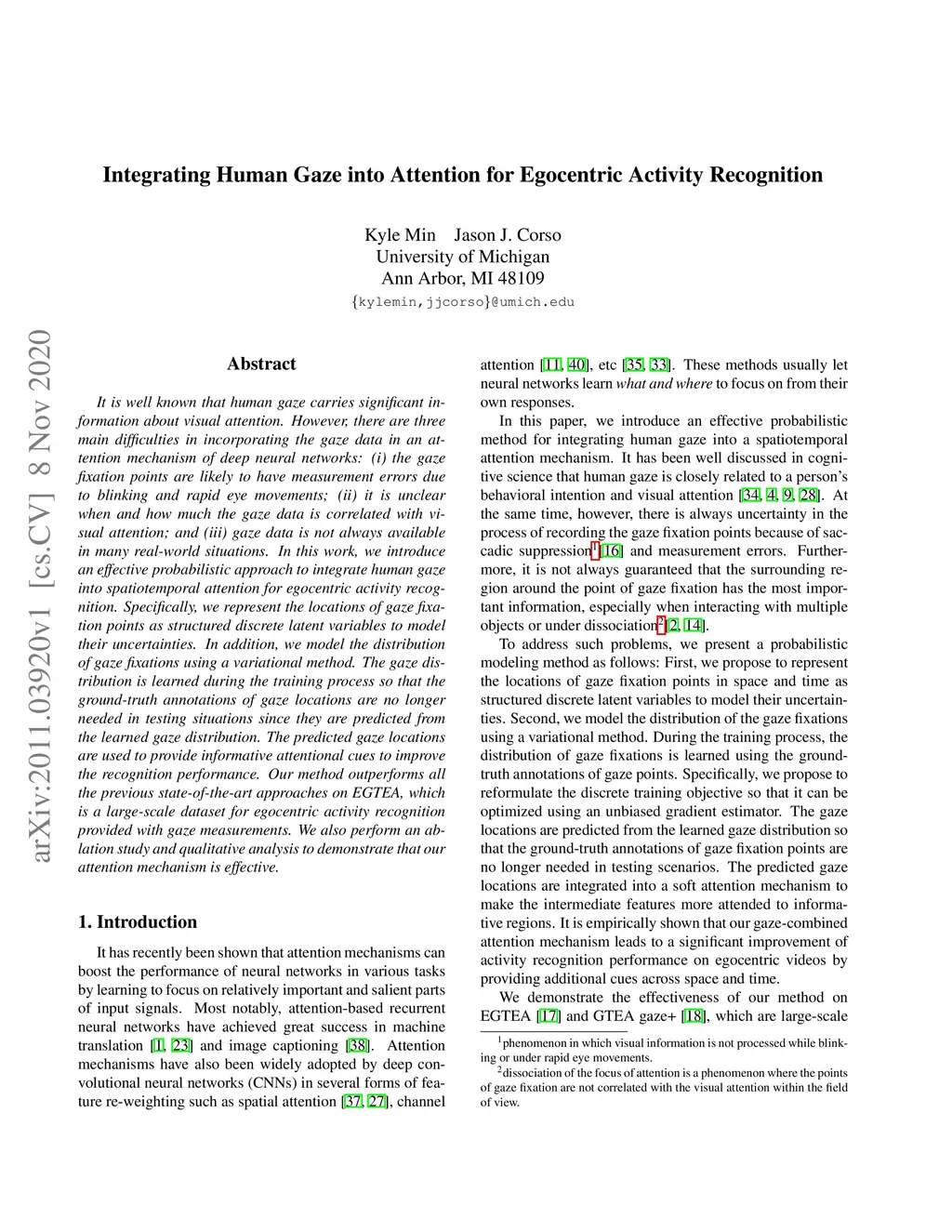It is well known that human gaze carries significant information about visual attention. However, there are three main difficulties in incorporating the gaze data in an attention mechanism of deep neural networks: 1) the gaze fixation points are likely to have measurement errors due to blinking and rapid eye movements; 2) it is unclear when and how much the gaze data is correlated with visual attention; and 3) gaze data is not always available in many real-world situations. In this work, we introduce an effective probabilistic approach to integrate human gaze into spatiotemporal attention for egocentric activity recognition. Specifically, we represent the locations of gaze fixation points as structured discrete latent variables to model their uncertainties. In addition, we model the distribution of gaze fixations using a variational method. The gaze distribution is learned during the training process so that the ground-truth annotations of gaze locations are no longer needed in testing situations since they are predicted from the learned gaze distribution. The predicted gaze locations are used to provide informative attentional cues to improve the recognition performance. Our method outperforms all the previous state-of-the-art approaches on EGTEA, which is a large-scale dataset for egocentric activity recognition provided with gaze measurements. We also perform an ablation study and qualitative analysis to demonstrate that our attention mechanism is effective.