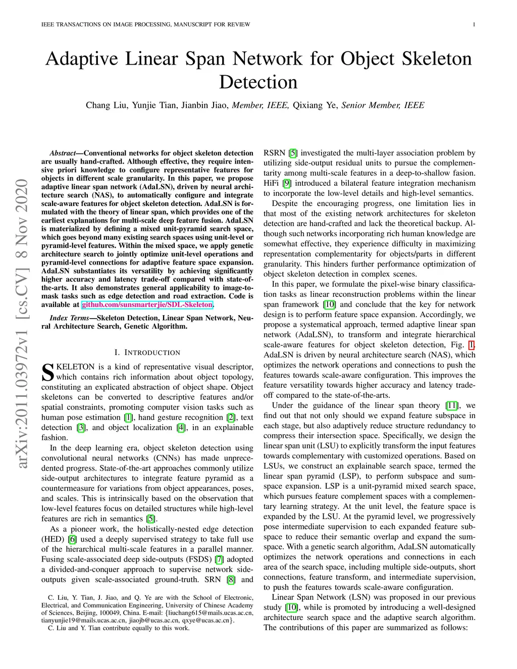 Conventional networks for object skeleton detection are usually hand-crafted. Although effective, they require intensive priori knowledge to configure representative features for objects in different scale granularity.In this paper, we propose adaptive linear span network (AdaLSN), driven by neural architecture search (NAS), to automatically configure and integrate scale-aware features for object skeleton detection. AdaLSN is formulated with the theory of linear span, which provides one of the earliest explanations for multi-scale deep feature fusion. AdaLSN is materialized by defining a mixed unit-pyramid search space, which goes beyond many existing search spaces using unit-level or pyramid-level features.Within the mixed space, we apply genetic architecture search to jointly optimize unit-level operations and pyramid-level connections for adaptive feature space expansion. AdaLSN substantiates its versatility by achieving significantly higher accuracy and latency trade-off compared with state-of-the-arts. It also demonstrates general applicability to image-to-mask tasks such as edge detection and road extraction. Code is available at \href{https://github.com/sunsmarterjie/SDL-Skeleton}{\color{magenta}github.com/sunsmarterjie/SDL-Skeleton}.