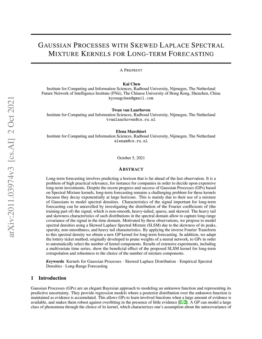 Long-term forecasting involves predicting a horizon that is far ahead of the last observation. It is a problem of high practical relevance, for instance for companies in order to decide upon expensive long-term investments. Despite the recent progress and success of Gaussian processes (GPs) based on spectral mixture kernels, long-term forecasting remains a challenging problem for these kernels because they decay exponentially at large horizons. This is mainly due to their use of a mixture of Gaussians to model spectral densities. Characteristics of the signal important for long-term forecasting can be unravelled by investigating the distribution of the Fourier coefficients of (the training part of) the signal, which is non-smooth, heavy-tailed, sparse, and skewed. The heavy tail and skewness characteristics of such distributions in the spectral domain allow to capture long-range covariance of the signal in the time domain. Motivated by these observations, we propose to model spectral densities using a skewed Laplace spectral mixture (SLSM) due to the skewness of its peaks, sparsity, non-smoothness, and heavy tail characteristics. By applying the inverse Fourier Transform to this spectral density we obtain a new GP kernel for long-term forecasting. In addition, we adapt the lottery ticket method, originally developed to prune weights of a neural network, to GPs in order to automatically select the number of kernel components. Results of extensive experiments, including a multivariate time series, show the beneficial effect of the proposed SLSM kernel for long-term extrapolation and robustness to the choice of the number of mixture components.