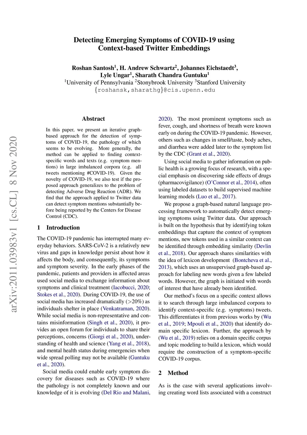 In this paper, we present an iterative graph-based approach for the detection of symptoms of COVID-19, the pathology of which seems to be evolving. More generally, the method can be applied to finding context-specific words and texts (e.g. symptom mentions) in large imbalanced corpora (e.g. all tweets mentioning #COVID-19). Given the novelty of COVID-19, we also test if the proposed approach generalizes to the problem of detecting Adverse Drug Reaction (ADR). We find that the approach applied to Twitter data can detect symptom mentions substantially before being reported by the Centers for Disease Control (CDC).