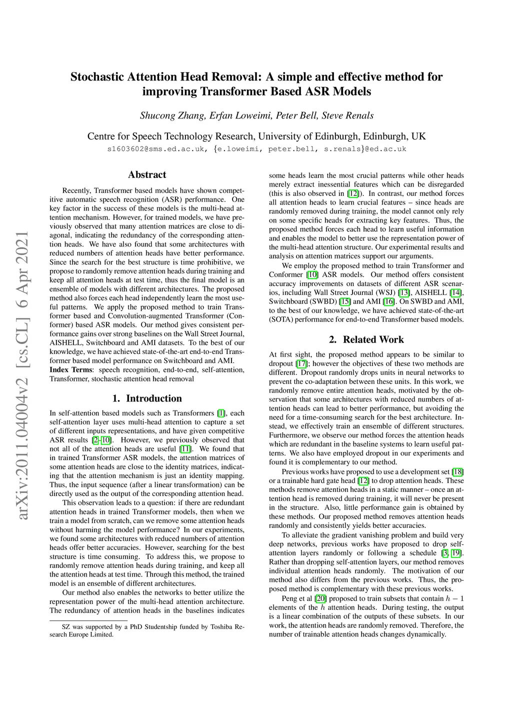 Stochastic Attention Head Removal: A Simple and Effective Method for