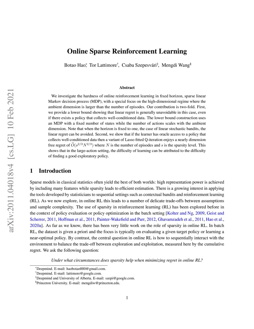 We investigate the hardness of online reinforcement learning in fixed horizon, sparse linear Markov decision process (MDP), with a special focus on the high-dimensional regime where the ambient dimension is larger than the number of episodes. Our contribution is two-fold. First, we provide a lower bound showing that linear regret is generally unavoidable in this case, even if there exists a policy that collects well-conditioned data. The lower bound construction uses an MDP with a fixed number of states while the number of actions scales with the ambient dimension. Note that when the horizon is fixed to one, the case of linear stochastic bandits, the linear regret can be avoided. Second, we show that if the learner has oracle access to a policy that collects well-conditioned data then a variant of Lasso fitted Q-iteration enjoys a nearly dimension-free regret of where is the number of episodes and is the sparsity level. This shows that in the large-action setting, the difficulty of learning can be attributed to the difficulty of finding a good exploratory policy.