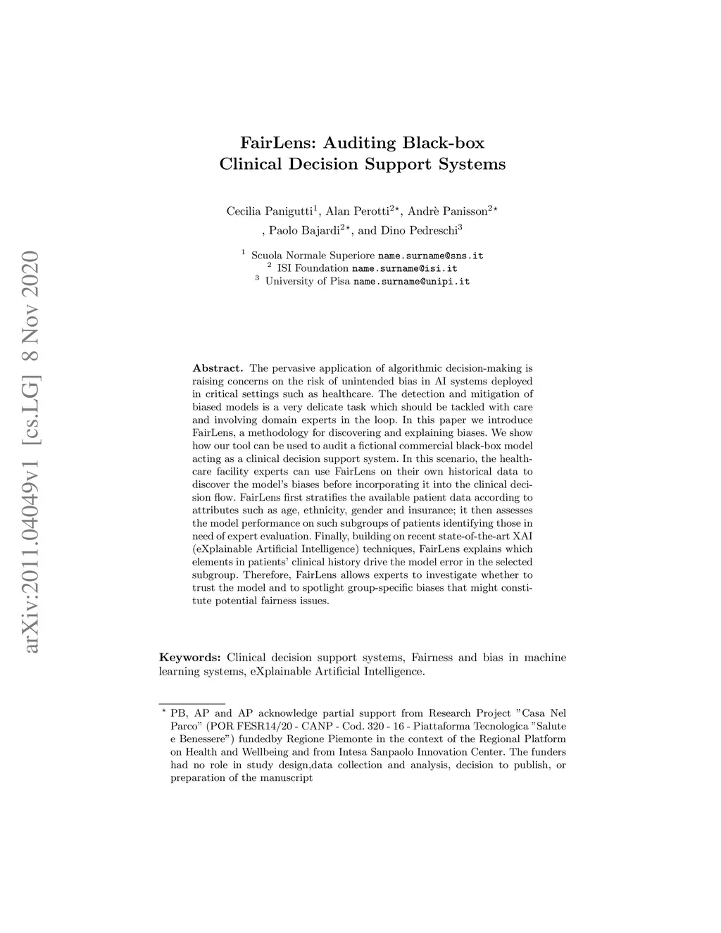 The pervasive application of algorithmic decision-making is raising concerns on the risk of unintended bias in AI systems deployed in critical settings such as healthcare. The detection and mitigation of biased models is a very delicate task which should be tackled with care and involving domain experts in the loop. In this paper we introduce FairLens, a methodology for discovering and explaining biases. We show how our tool can be used to audit a fictional commercial black-box model acting as a clinical decision support system. In this scenario, the healthcare facility experts can use FairLens on their own historical data to discover the model's biases before incorporating it into the clinical decision flow. FairLens first stratifies the available patient data according to attributes such as age, ethnicity, gender and insurance; it then assesses the model performance on such subgroups of patients identifying those in need of expert evaluation. Finally, building on recent state-of-the-art XAI (eXplainable Artificial Intelligence) techniques, FairLens explains which elements in patients' clinical history drive the model error in the selected subgroup. Therefore, FairLens allows experts to investigate whether to trust the model and to spotlight group-specific biases that might constitute potential fairness issues.