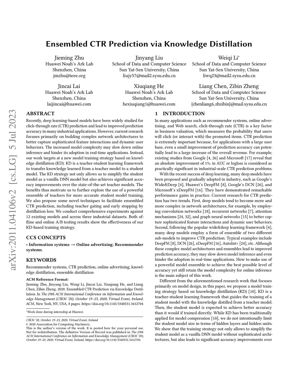 Recently, deep learning-based models have been widely studied for click-through rate (CTR) prediction and lead to improved prediction accuracy in many industrial applications. However, current research focuses primarily on building complex network architectures to better capture sophisticated feature interactions and dynamic user behaviors. The increased model complexity may slow down online inference and hinder its adoption in real-time applications. Instead, our work targets at a new model training strategy based on knowledge distillation (KD). KD is a teacher-student learning framework to transfer knowledge learned from a teacher model to a student model. The KD strategy not only allows us to simplify the student model as a vanilla DNN model but also achieves significant accuracy improvements over the state-of-the-art teacher models. The benefits thus motivate us to further explore the use of a powerful ensemble of teachers for more accurate student model training. We also propose some novel techniques to facilitate ensembled CTR prediction, including teacher gating and early stopping by distillation loss. We conduct comprehensive experiments against 12 existing models and across three industrial datasets. Both offline and online A/B testing results show the effectiveness of our KD-based training strategy.