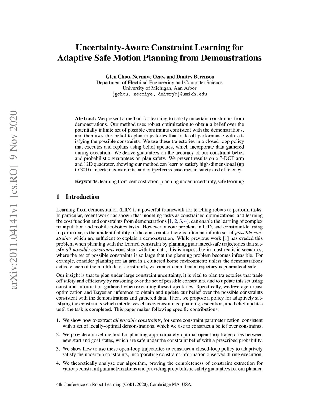 We present a method for learning to satisfy uncertain constraints from demonstrations. Our method uses robust optimization to obtain a belief over the potentially infinite set of possible constraints consistent with the demonstrations, and then uses this belief to plan trajectories that trade off performance with satisfying the possible constraints. We use these trajectories in a closed-loop policy that executes and replans using belief updates, which incorporate data gathered during execution. We derive guarantees on the accuracy of our constraint belief and probabilistic guarantees on plan safety. We present results on a 7-DOF arm and 12D quadrotor, showing our method can learn to satisfy high-dimensional (up to 30D) uncertain constraints, and outperforms baselines in safety and efficiency.