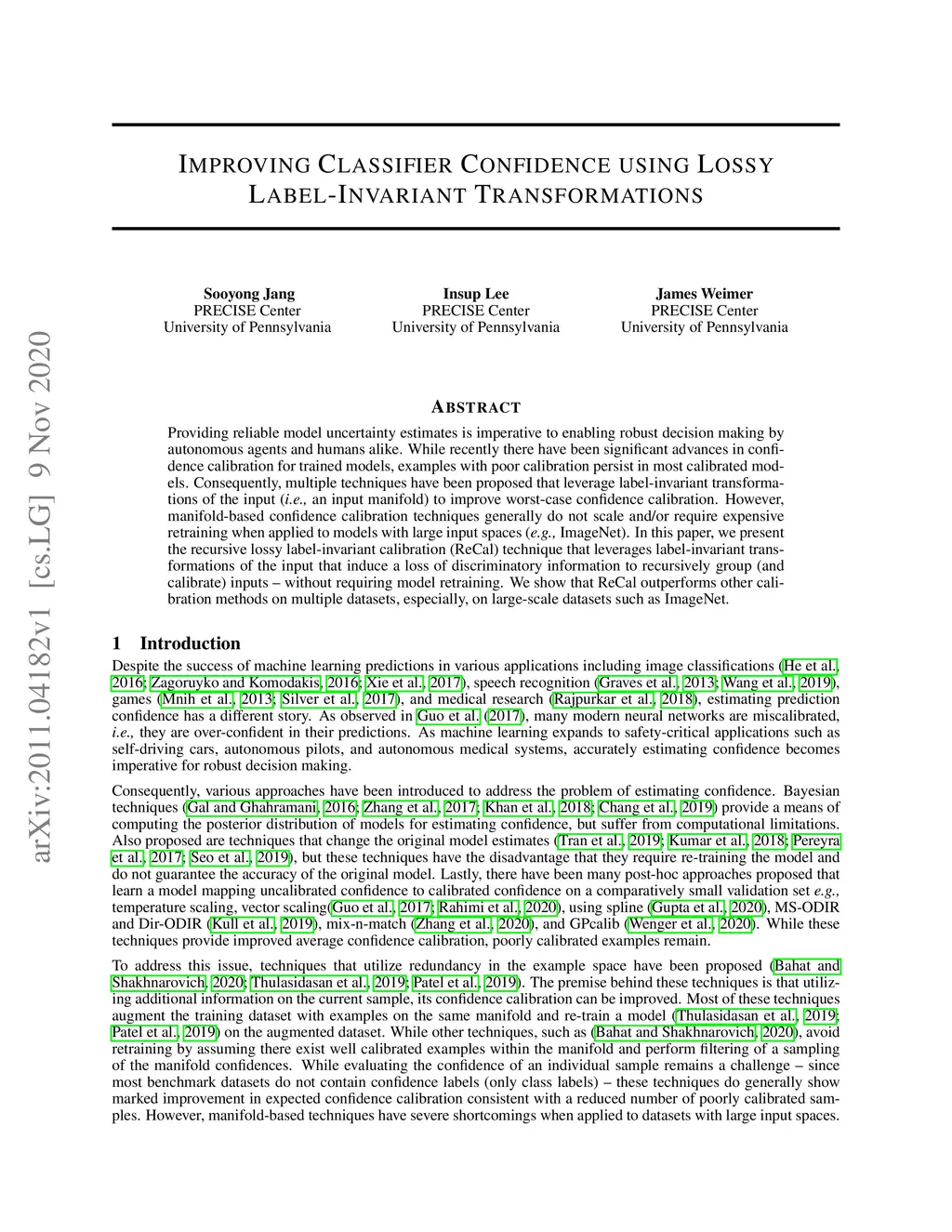 Providing reliable model uncertainty estimates is imperative to enabling robust decision making by autonomous agents and humans alike. While recently there have been significant advances in confidence calibration for trained models, examples with poor calibration persist in most calibrated models. Consequently, multiple techniques have been proposed that leverage label-invariant transformations of the input (i.e., an input manifold) to improve worst-case confidence calibration. However, manifold-based confidence calibration techniques generally do not scale and/or require expensive retraining when applied to models with large input spaces (e.g., ImageNet). In this paper, we present the recursive lossy label-invariant calibration (ReCal) technique that leverages label-invariant transformations of the input that induce a loss of discriminatory information to recursively group (and calibrate) inputs - without requiring model retraining. We show that ReCal outperforms other calibration methods on multiple datasets, especially, on large-scale datasets such as ImageNet.