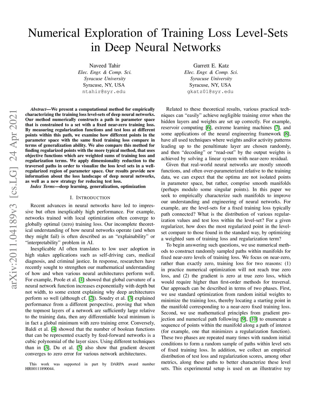 We present a computational method for empirically characterizing the training loss level-sets of deep neural networks. Our method numerically constructs a path in parameter space that is constrained to a set with a fixed near-zero training loss. By measuring regularization functions and test loss at different points within this path, we examine how different points in the parameter space with the same fixed training loss compare in terms of generalization ability. We also compare this method for finding regularized points with the more typical method, that uses objective functions which are weighted sums of training loss and regularization terms. We apply dimensionality reduction to the traversed paths in order to visualize the loss level sets in a well-regularized region of parameter space. Our results provide new information about the loss landscape of deep neural networks, as well as a new strategy for reducing test loss.