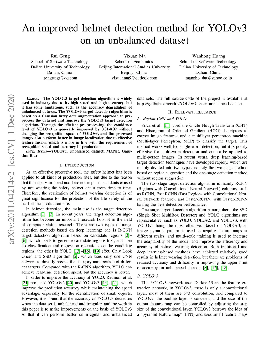 An improved helmet detection method for YOLOv3 on an unbalanced dataset