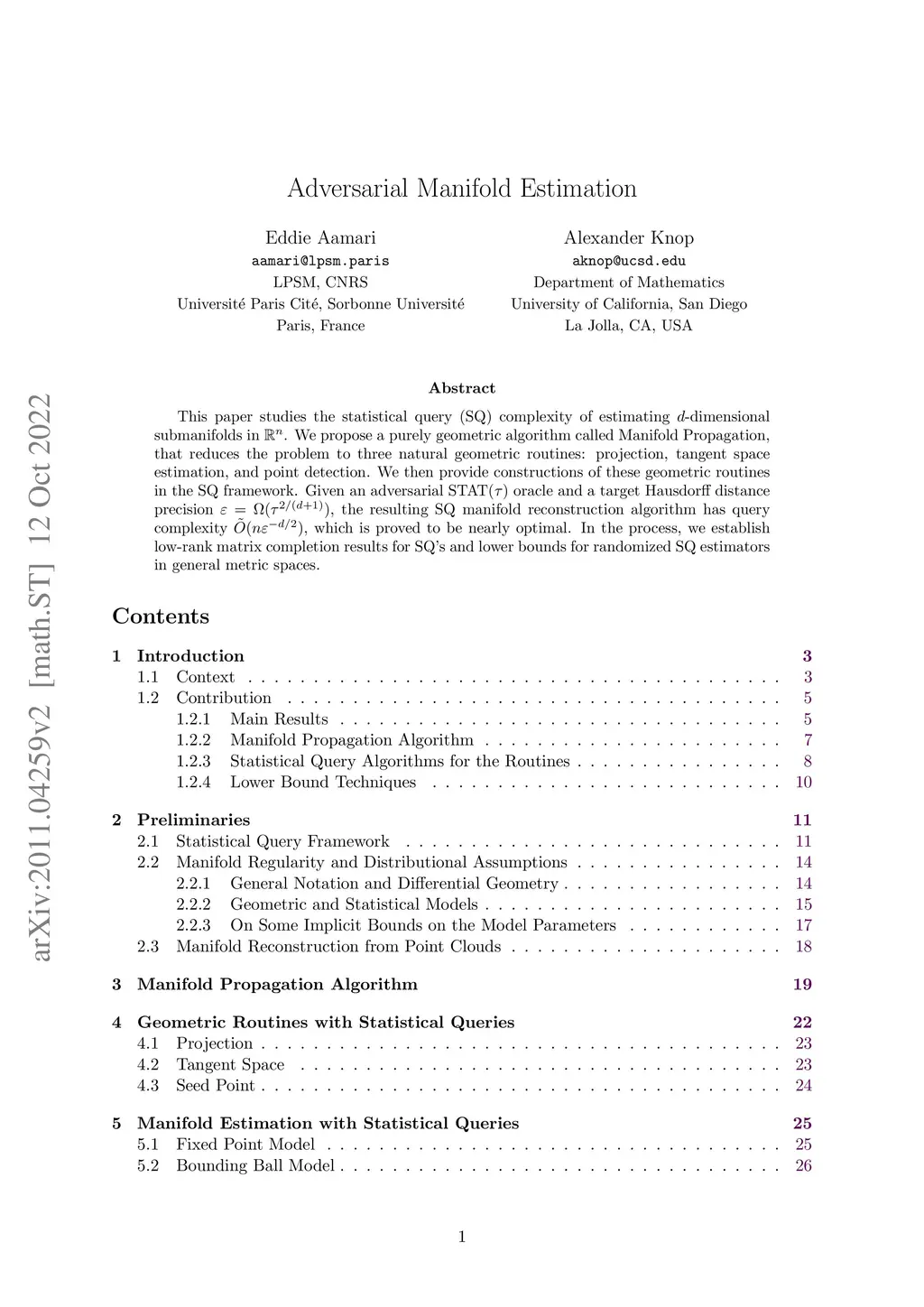 This paper studies the statistical query (SQ) complexity of estimating -dimensional submanifolds in . We propose a purely geometric algorithm called Manifold Propagation, that reduces the problem to three natural geometric routines: projection, tangent space estimation, and point detection. We then provide constructions of these geometric routines in the SQ framework. Given an adversarial oracle and a target Hausdorff distance precision , the resulting SQ manifold reconstruction algorithm has query complexity , which is proved to be nearly optimal. In the process, we establish low-rank matrix completion results for SQ's and lower bounds for randomized SQ estimators in general metric spaces.
