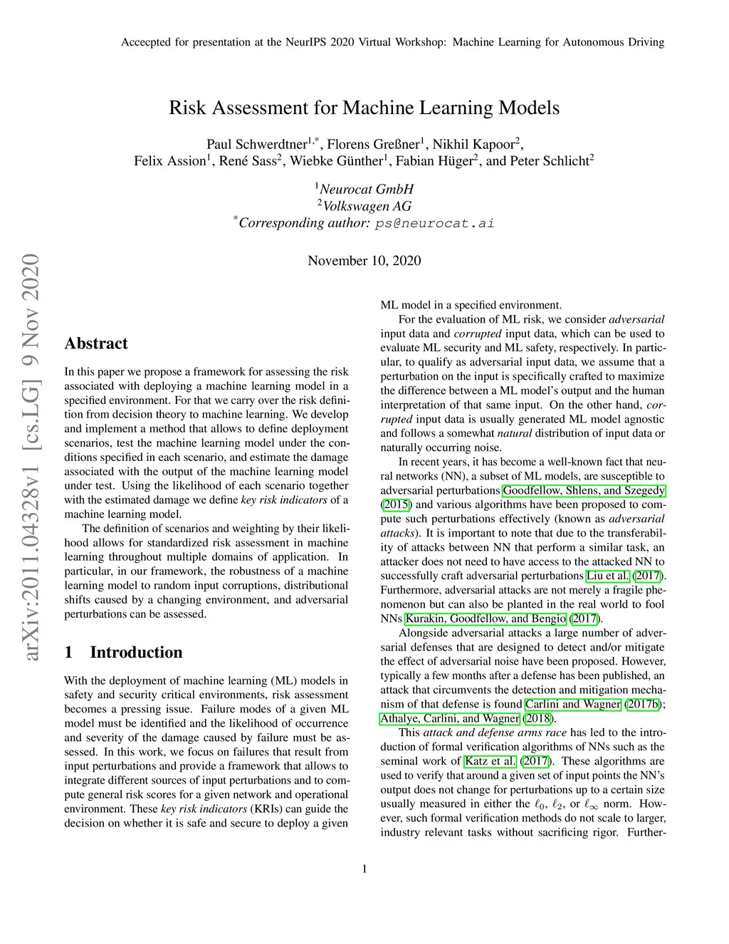 In this paper we propose a framework for assessing the risk associated with deploying a machine learning model in a specified environment. For that we carry over the risk definition from decision theory to machine learning. We develop and implement a method that allows to define deployment scenarios, test the machine learning model under the conditions specified in each scenario, and estimate the damage associated with the output of the machine learning model under test. Using the likelihood of each scenario together with the estimated damage we define \emph{key risk indicators} of a machine learning model. The definition of scenarios and weighting by their likelihood allows for standardized risk assessment in machine learning throughout multiple domains of application. In particular, in our framework, the robustness of a machine learning model to random input corruptions, distributional shifts caused by a changing environment, and adversarial perturbations can be assessed.