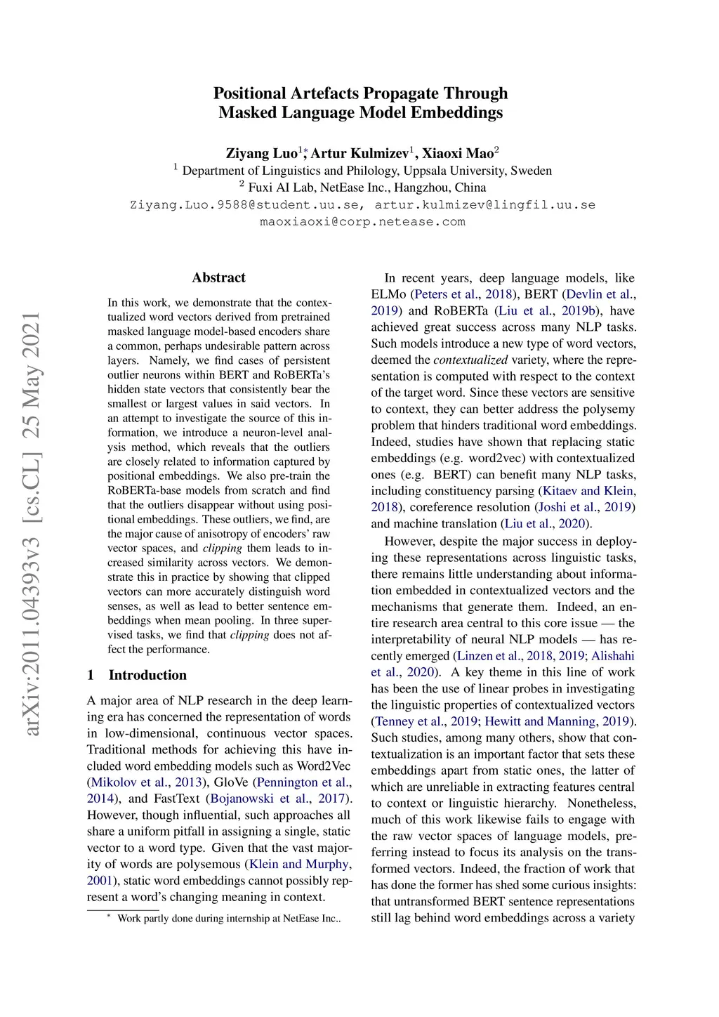 Positional Artefacts Propagate Through Masked Language Model Embeddings
