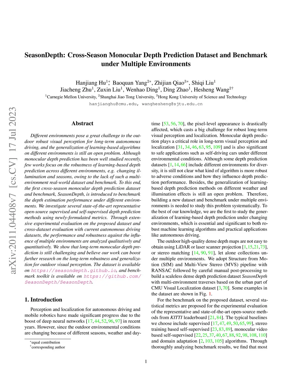 SeasonDepth: Cross-Season Monocular Depth Prediction Dataset and