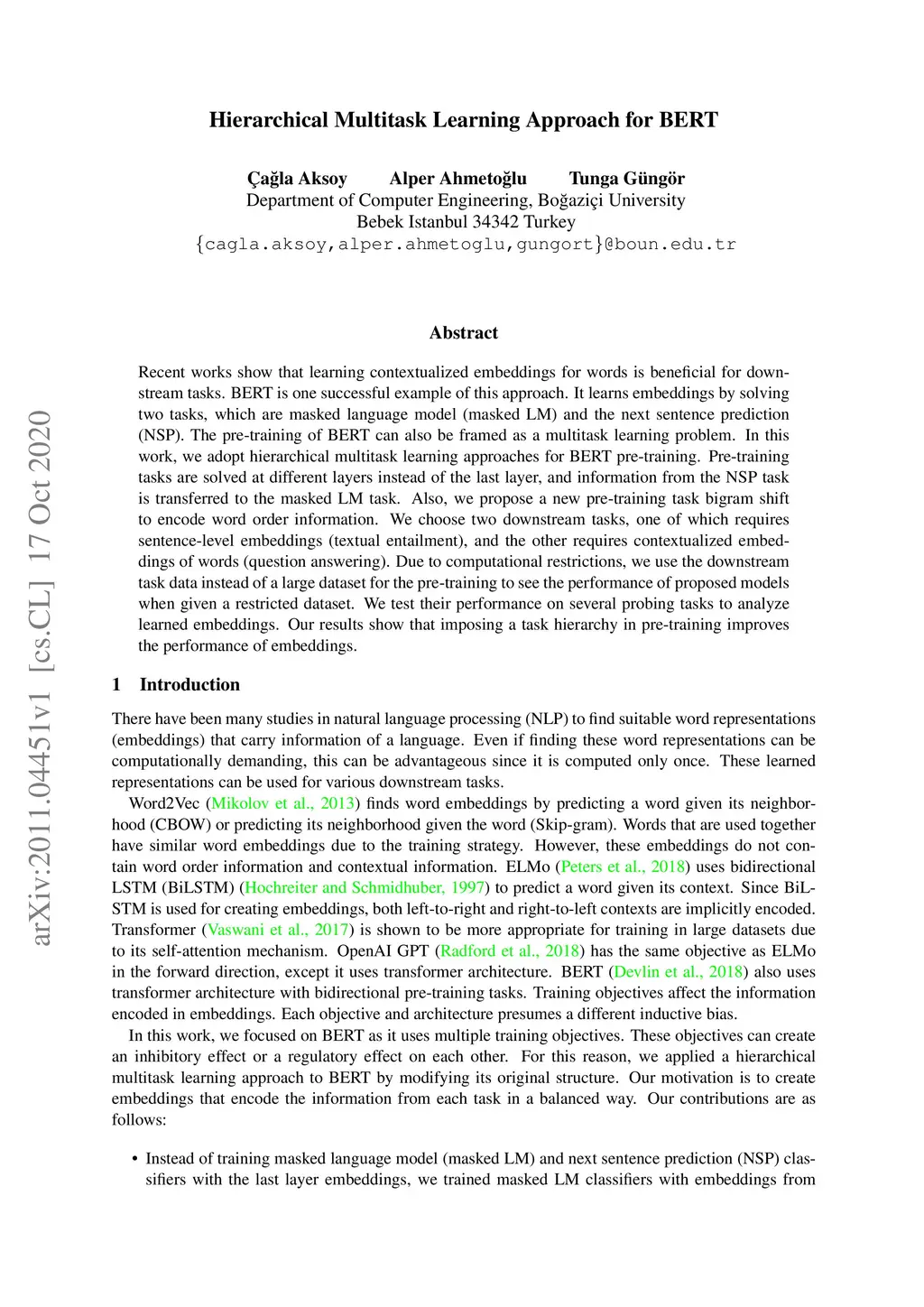 Recent works show that learning contextualized embeddings for words is beneficial for downstream tasks. BERT is one successful example of this approach. It learns embeddings by solving two tasks, which are masked language model (masked LM) and the next sentence prediction (NSP). The pre-training of BERT can also be framed as a multitask learning problem. In this work, we adopt hierarchical multitask learning approaches for BERT pre-training. Pre-training tasks are solved at different layers instead of the last layer, and information from the NSP task is transferred to the masked LM task. Also, we propose a new pre-training task bigram shift to encode word order information. We choose two downstream tasks, one of which requires sentence-level embeddings (textual entailment), and the other requires contextualized embeddings of words (question answering). Due to computational restrictions, we use the downstream task data instead of a large dataset for the pre-training to see the performance of proposed models when given a restricted dataset. We test their performance on several probing tasks to analyze learned embeddings. Our results show that imposing a task hierarchy in pre-training improves the performance of embeddings.