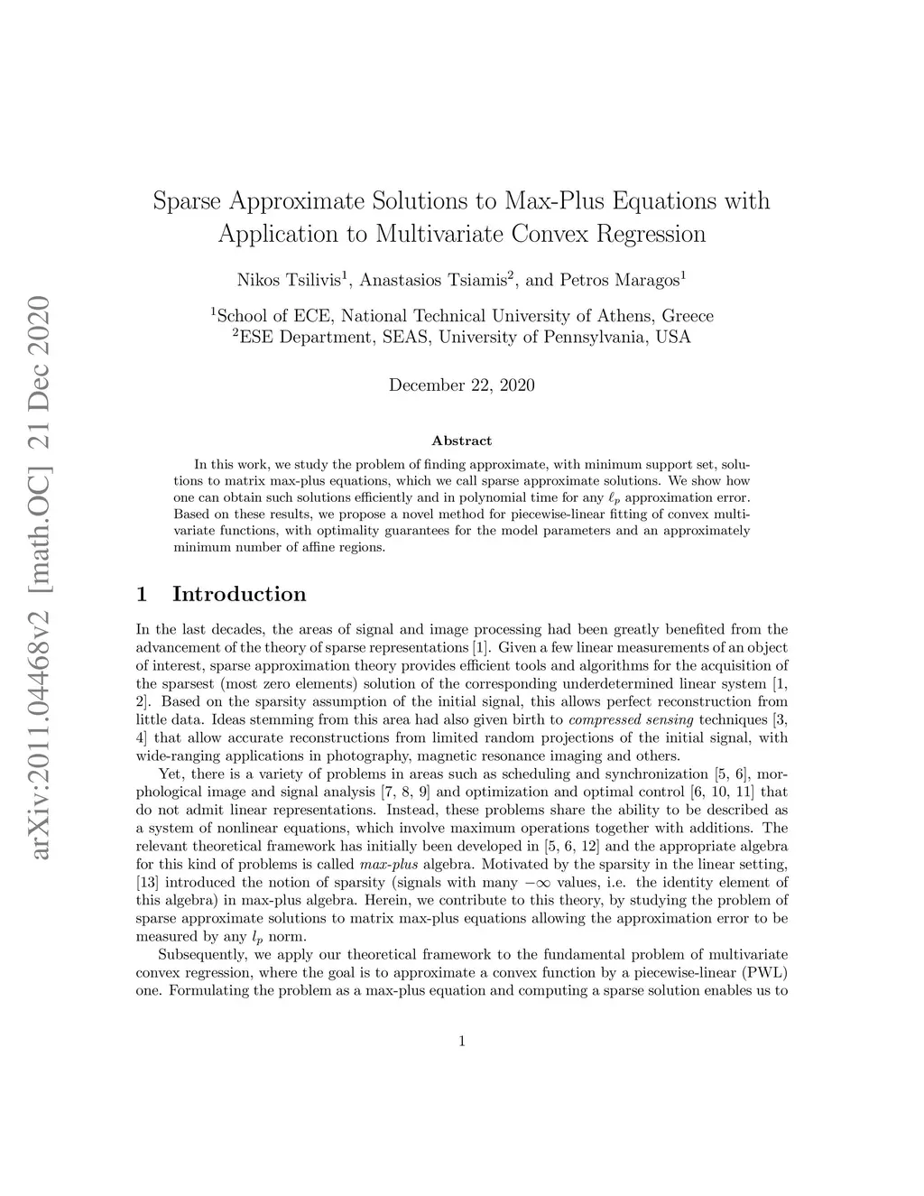 In this work, we study the problem of finding approximate, with minimum support set, solutions to matrix max-plus equations, which we call sparse approximate solutions. We show how one can obtain such solutions efficiently and in polynomial time for any approximation error. Based on these results, we propose a novel method for piecewise-linear fitting of convex multivariate functions, with optimality guarantees for the model parameters and an approximately minimum number of affine regions.
