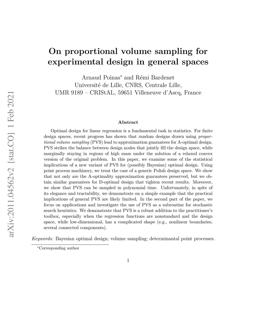 Optimal experimental design for linear regression is a fundamental research topic in statistics and related fields. For finite design spaces, recent progress has shown that random designs drawn using proportional volume sampling (PVS) lead to approximation guarantees for A-optimal design. Proportional volume sampling strikes the balance between forcing the design nodes to jointly fill the design space, while marginally staying in regions of high mass under the solution of a relaxed convex version of the optimal problem. In this paper, we examine some of the statistical implications of PVS. First, we extend PVS to generic Polish design spaces, and we show that not only are the A-optimality approximation guarantees preserved, but we obtain similar guarantees for D-optimal design. Through a connection with determinantal point processes, another type of repulsive random design, we show that PVS can be sampled in polynomial time. Unfortunately, in spite of its mathematical elegance and computational tractability, we demonstrate on a simple example that the practical implications of general PVS are likely limited. In the second part of the paper, we focus on applications and rather investigate the use of PVS as a subroutine for stochastic search heuristics. We demonstrate that PVS is a robust addition to the practitioner's toolbox, especially when the regression functions are nonstandard and the design space is low-dimensional but has a complicated shape (e.g., nonlinear boundaries, several connected components).