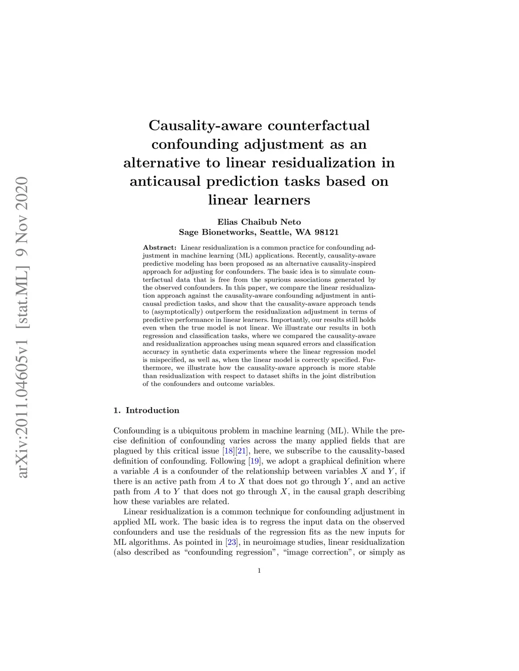 Linear residualization is a common practice for confounding adjustment in machine learning (ML) applications. Recently, causality-aware predictive modeling has been proposed as an alternative causality-inspired approach for adjusting for confounders. The basic idea is to simulate counterfactual data that is free from the spurious associations generated by the observed confounders. In this paper, we compare the linear residualization approach against the causality-aware confounding adjustment in anticausal prediction tasks, and show that the causality-aware approach tends to (asymptotically) outperform the residualization adjustment in terms of predictive performance in linear learners. Importantly, our results still holds even when the true model is not linear. We illustrate our results in both regression and classification tasks, where we compared the causality-aware and residualization approaches using mean squared errors and classification accuracy in synthetic data experiments where the linear regression model is mispecified, as well as, when the linear model is correctly specified. Furthermore, we illustrate how the causality-aware approach is more stable than residualization with respect to dataset shifts in the joint distribution of the confounders and outcome variables.
