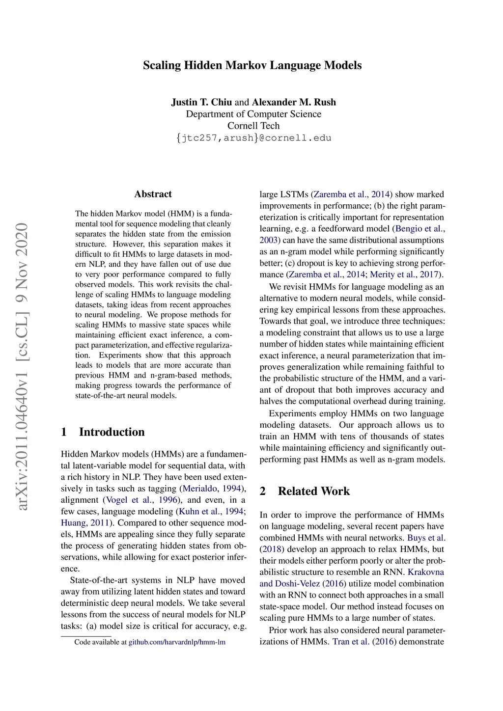 The hidden Markov model (HMM) is a fundamental tool for sequence modeling that cleanly separates the hidden state from the emission structure. However, this separation makes it difficult to fit HMMs to large datasets in modern NLP, and they have fallen out of use due to very poor performance compared to fully observed models. This work revisits the challenge of scaling HMMs to language modeling datasets, taking ideas from recent approaches to neural modeling. We propose methods for scaling HMMs to massive state spaces while maintaining efficient exact inference, a compact parameterization, and effective regularization. Experiments show that this approach leads to models that are more accurate than previous HMM and n-gram-based methods, making progress towards the performance of state-of-the-art neural models.