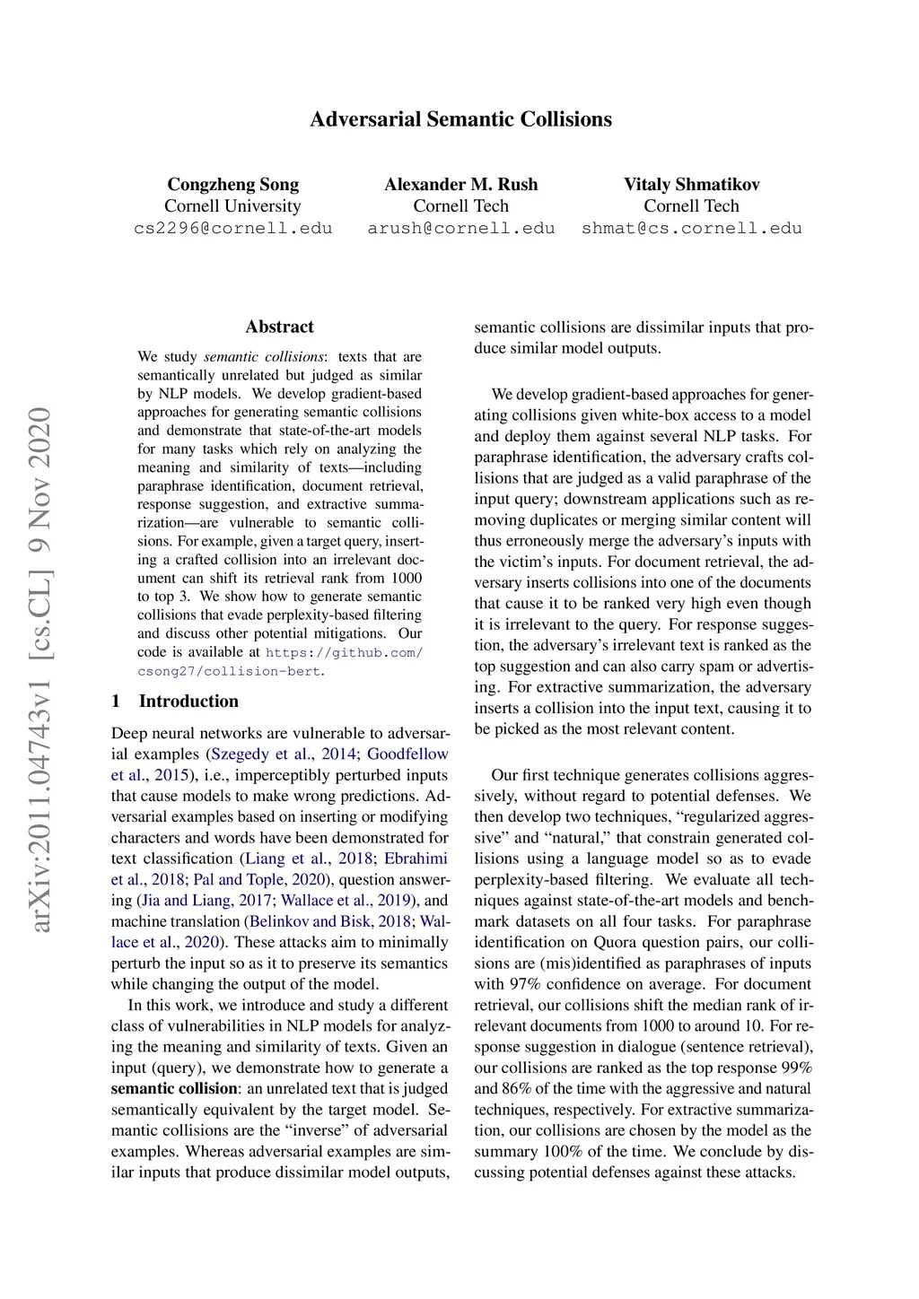 We study semantic collisions: texts that are semantically unrelated but judged as similar by NLP models. We develop gradient-based approaches for generating semantic collisions and demonstrate that state-of-the-art models for many tasks which rely on analyzing the meaning and similarity of texts-- including paraphrase identification, document retrieval, response suggestion, and extractive summarization-- are vulnerable to semantic collisions. For example, given a target query, inserting a crafted collision into an irrelevant document can shift its retrieval rank from 1000 to top 3. We show how to generate semantic collisions that evade perplexity-based filtering and discuss other potential mitigations. Our code is available at https://github.com/csong27/collision-bert.