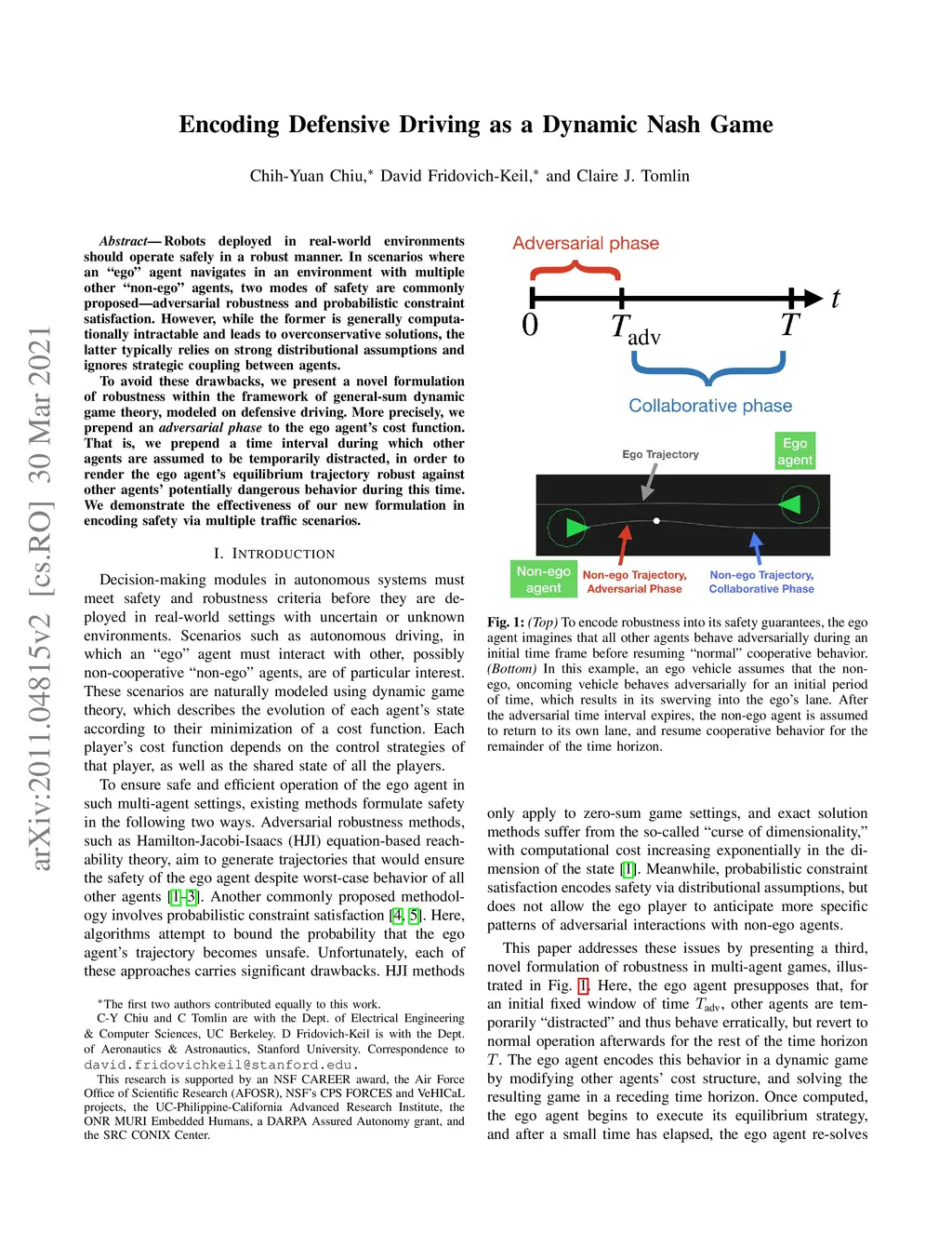 Robots deployed in real-world environments should operate safely in a robust manner. In scenarios where an "ego" agent navigates in an environment with multiple other "non-ego" agents, two modes of safety are commonly proposed -- adversarial robustness and probabilistic constraint satisfaction. However, while the former is generally computationally intractable and leads to overconservative solutions, the latter typically relies on strong distributional assumptions and ignores strategic coupling between agents. To avoid these drawbacks, we present a novel formulation of robustness within the framework of general-sum dynamic game theory, modeled on defensive driving. More precisely, we prepend an adversarial phase to the ego agent's cost function. That is, we prepend a time interval during which other agents are assumed to be temporarily distracted, in order to render the ego agent's equilibrium trajectory robust against other agents' potentially dangerous behavior during this time. We demonstrate the effectiveness of our new formulation in encoding safety via multiple traffic scenarios.
