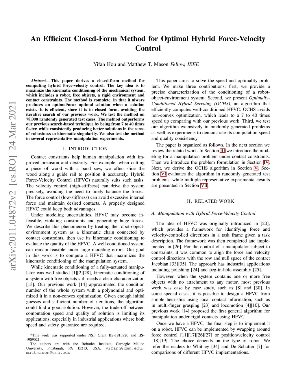 This paper derives a closed-form method for computing hybrid force-velocity control. The key idea is to maximize the kinematic conditioning of the mechanical system, which includes a robot, free objects, a rigid environment and contact constraints. The method is complete, in that it always produces an optimal/near optimal solution when a solution exists. It is efficient, since it is in closed form, avoiding the iterative search of previous work. We test the method on 78,000 randomly generated test cases. The method outperforms our previous search-based technique by being from 7 to 40 times faster, while consistently producing better solutions in the sense of robustness to kinematic singularity. We also test the method in several representative manipulation experiments.
