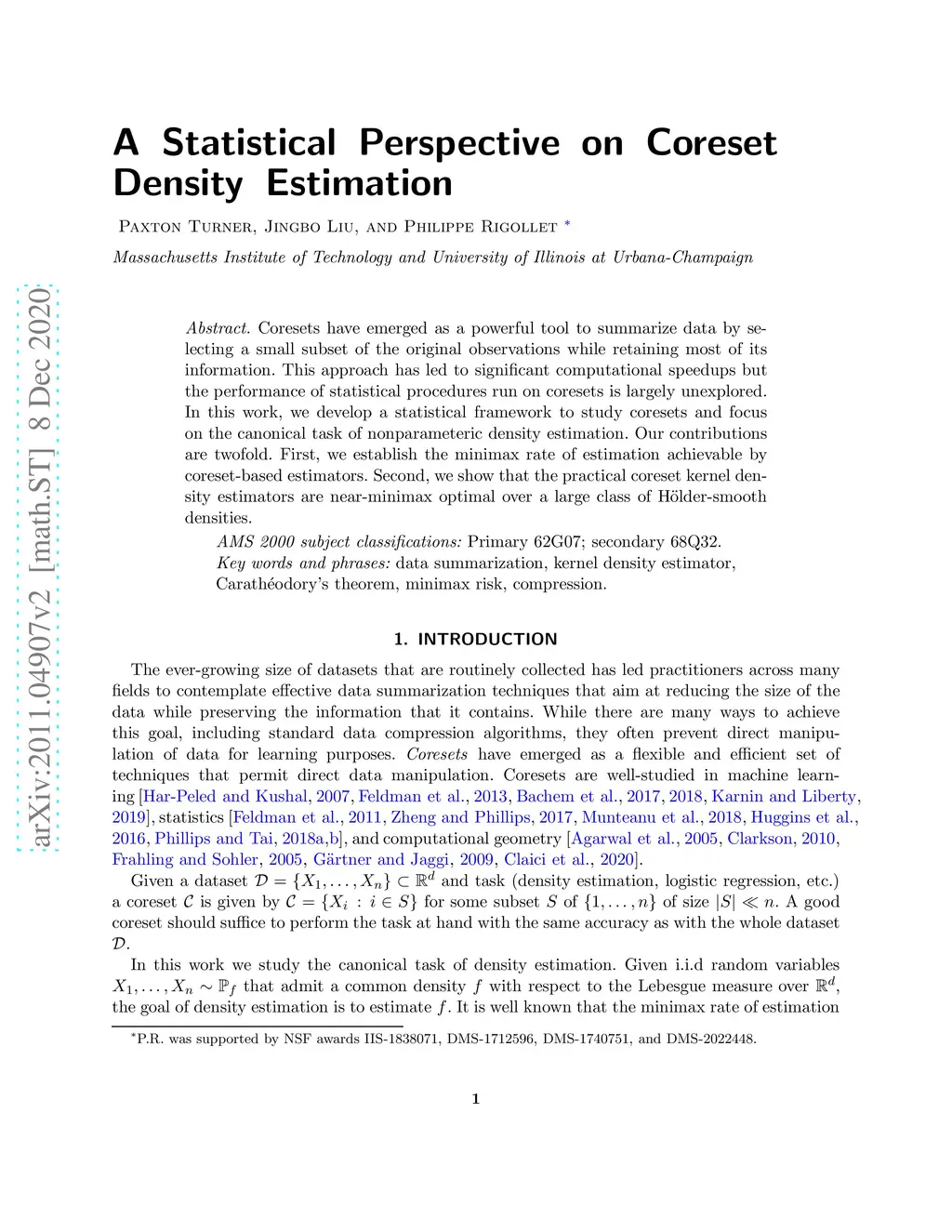 Coresets have emerged as a powerful tool to summarize data by selecting a small subset of the original observations while retaining most of its information. This approach has led to significant computational speedups but the performance of statistical procedures run on coresets is largely unexplored. In this work, we develop a statistical framework to study coresets and focus on the canonical task of nonparameteric density estimation. Our contributions are twofold. First, we establish the minimax rate of estimation achievable by coreset-based estimators. Second, we show that the practical coreset kernel density estimators are near-minimax optimal over a large class of H\"{o}lder-smooth densities.