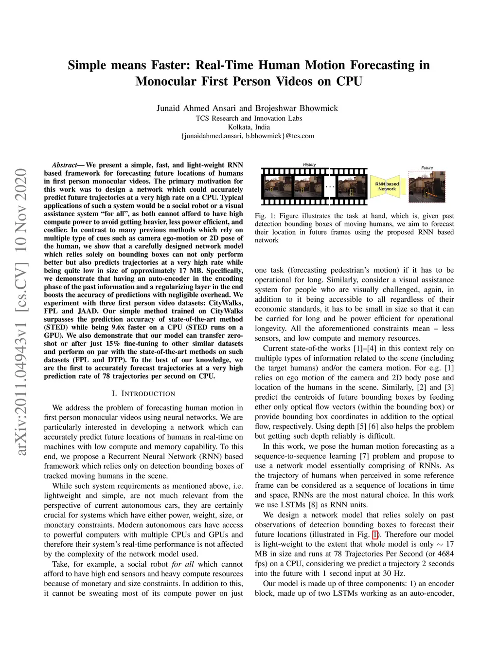 We present a simple, fast, and light-weight RNN based framework for forecasting future locations of humans in first person monocular videos. The primary motivation for this work was to design a network which could accurately predict future trajectories at a very high rate on a CPU. Typical applications of such a system would be a social robot or a visual assistance system for all, as both cannot afford to have high compute power to avoid getting heavier, less power efficient, and costlier. In contrast to many previous methods which rely on multiple type of cues such as camera ego-motion or 2D pose of the human, we show that a carefully designed network model which relies solely on bounding boxes can not only perform better but also predicts trajectories at a very high rate while being quite low in size of approximately 17 MB. Specifically, we demonstrate that having an auto-encoder in the encoding phase of the past information and a regularizing layer in the end boosts the accuracy of predictions with negligible overhead. We experiment with three first person video datasets: CityWalks, FPL and JAAD. Our simple method trained on CityWalks surpasses the prediction accuracy of state-of-the-art method (STED) while being 9.6x faster on a CPU (STED runs on a GPU). We also demonstrate that our model can transfer zero-shot or after just 15% fine-tuning to other similar datasets and perform on par with the state-of-the-art methods on such datasets (FPL and DTP). To the best of our knowledge, we are the first to accurately forecast trajectories at a very high prediction rate of 78 trajectories per second on CPU.