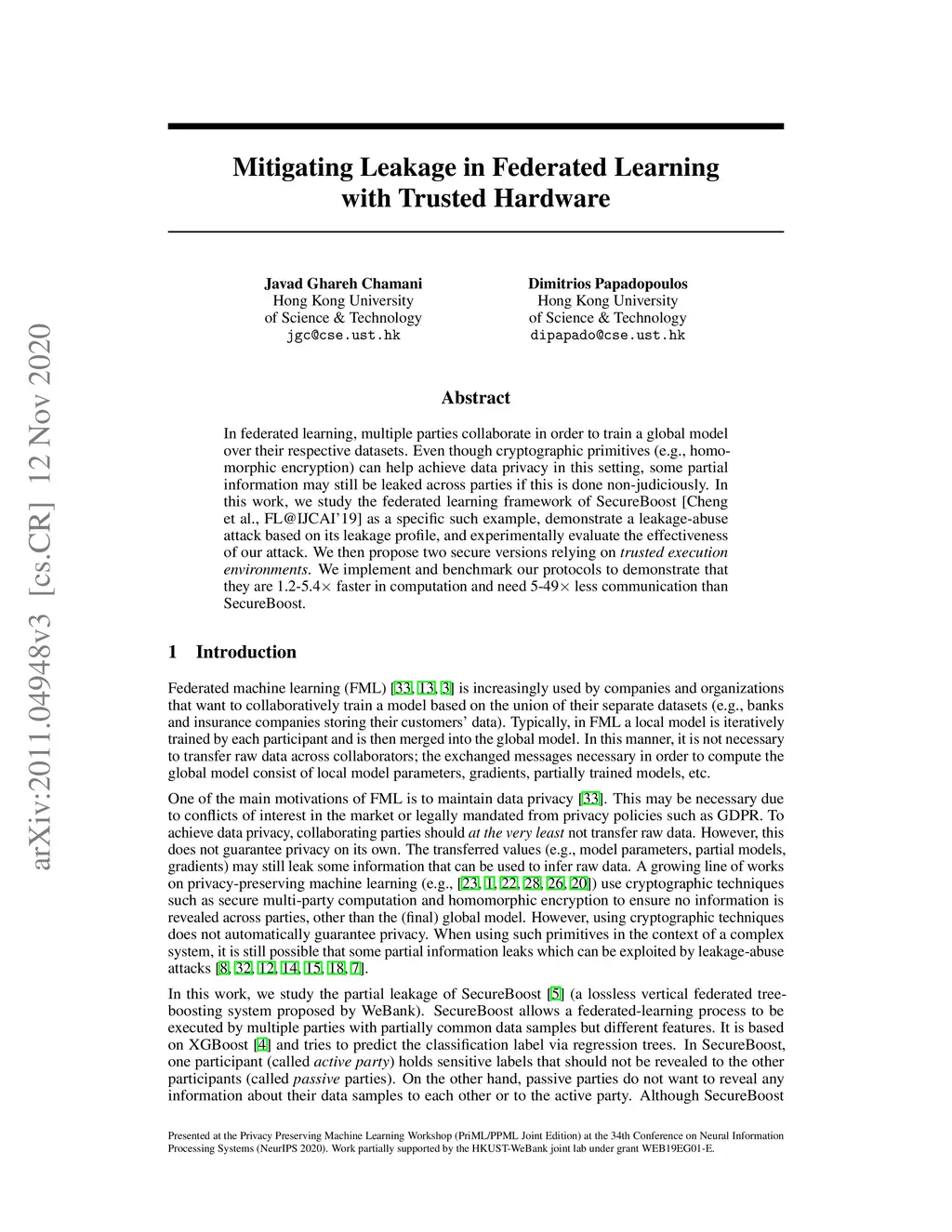 In federated learning, multiple parties collaborate in order to train a global model over their respective datasets. Even though cryptographic primitives (e.g., homomorphic encryption) can help achieve data privacy in this setting, some partial information may still be leaked across parties if this is done non-judiciously. In this work, we study the federated learning framework of SecureBoost [Cheng et al., FL@IJCAI'19] as a specific such example, demonstrate a leakage-abuse attack based on its leakage profile, and experimentally evaluate the effectiveness of our attack. We then propose two secure versions relying on trusted execution environments. We implement and benchmark our protocols to demonstrate that they are 1.2-5.4X faster in computation and need 5-49X less communication than SecureBoost.
