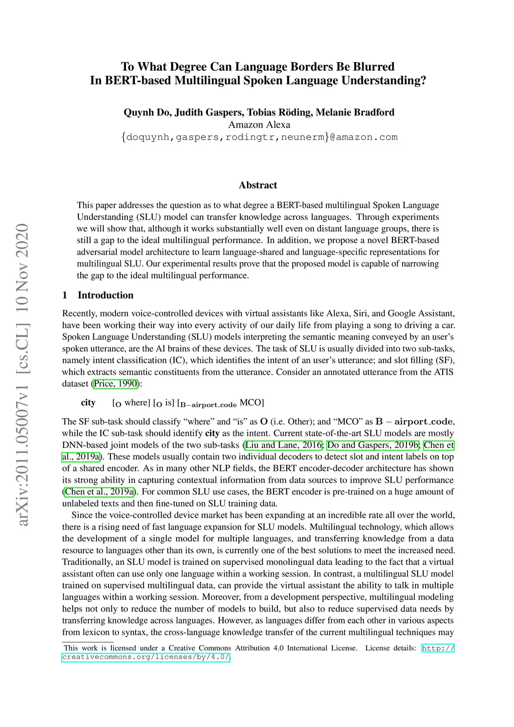 This paper addresses the question as to what degree a BERT-based multilingual Spoken Language Understanding (SLU) model can transfer knowledge across languages. Through experiments we will show that, although it works substantially well even on distant language groups, there is still a gap to the ideal multilingual performance. In addition, we propose a novel BERT-based adversarial model architecture to learn language-shared and language-specific representations for multilingual SLU. Our experimental results prove that the proposed model is capable of narrowing the gap to the ideal multilingual performance.