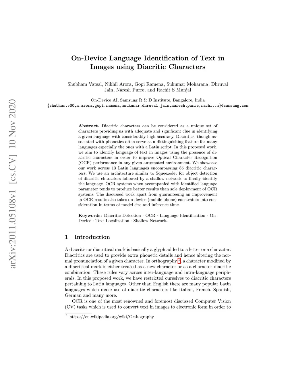 Diacritic characters can be considered as a unique set of characters providing us with adequate and significant clue in identifying a given language with considerably high accuracy. Diacritics, though associated with phonetics often serve as a distinguishing feature for many languages especially the ones with a Latin script. In this proposed work, we aim to identify language of text in images using the presence of diacritic characters in order to improve Optical Character Recognition (OCR) performance in any given automated environment. We showcase our work across 13 Latin languages encompassing 85 diacritic characters. We use an architecture similar to Squeezedet for object detection of diacritic characters followed by a shallow network to finally identify the language. OCR systems when accompanied with identified language parameter tends to produce better results than sole deployment of OCR systems. The discussed work apart from guaranteeing an improvement in OCR results also takes on-device (mobile phone) constraints into consideration in terms of model size and inference time.
