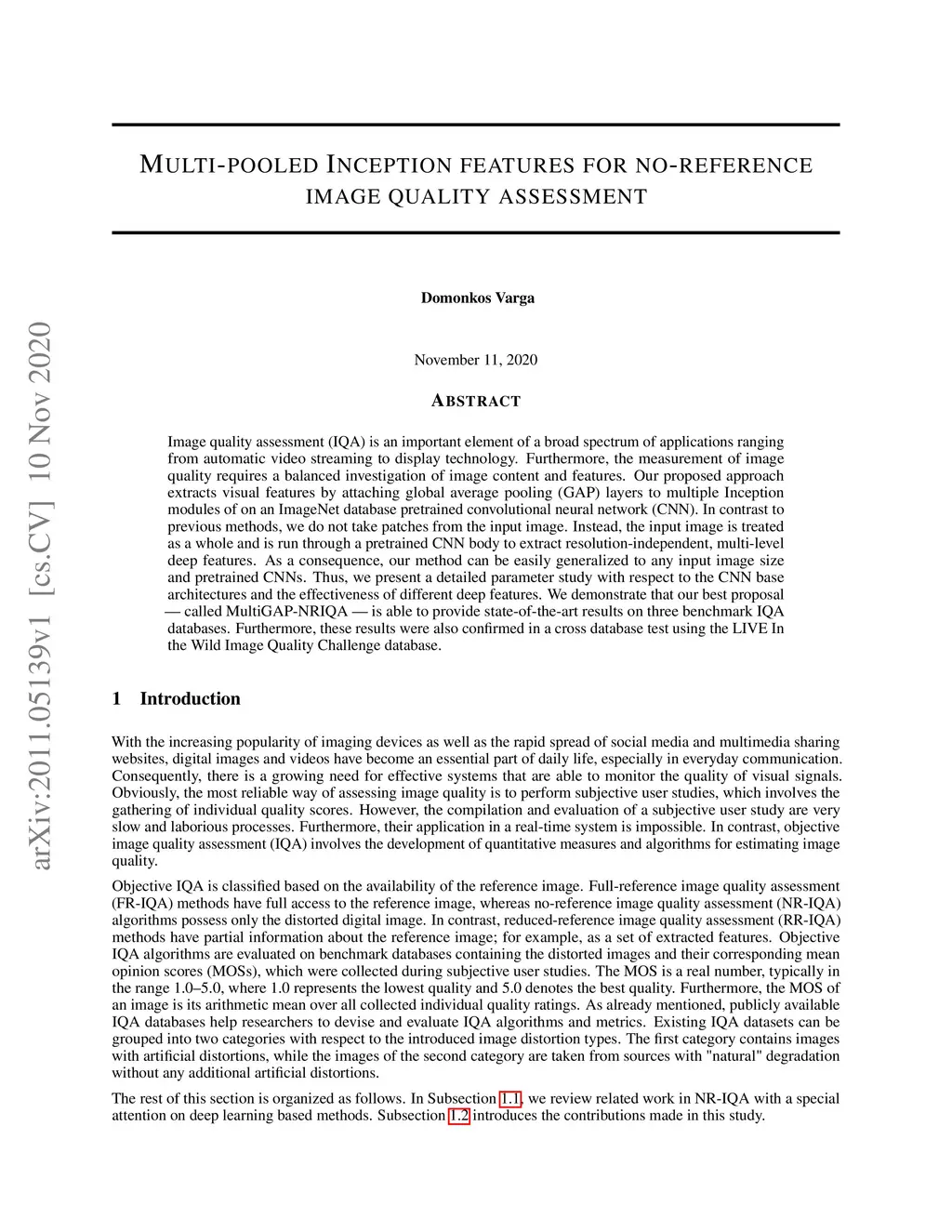 Image quality assessment (IQA) is an important element of a broad spectrum of applications ranging from automatic video streaming to display technology. Furthermore, the measurement of image quality requires a balanced investigation of image content and features. Our proposed approach extracts visual features by attaching global average pooling (GAP) layers to multiple Inception modules of on an ImageNet database pretrained convolutional neural network (CNN). In contrast to previous methods, we do not take patches from the input image. Instead, the input image is treated as a whole and is run through a pretrained CNN body to extract resolution-independent, multi-level deep features. As a consequence, our method can be easily generalized to any input image size and pretrained CNNs. Thus, we present a detailed parameter study with respect to the CNN base architectures and the effectiveness of different deep features. We demonstrate that our best proposal - called MultiGAP-NRIQA - is able to provide state-of-the-art results on three benchmark IQA databases. Furthermore, these results were also confirmed in a cross database test using the LIVE In the Wild Image Quality Challenge database.