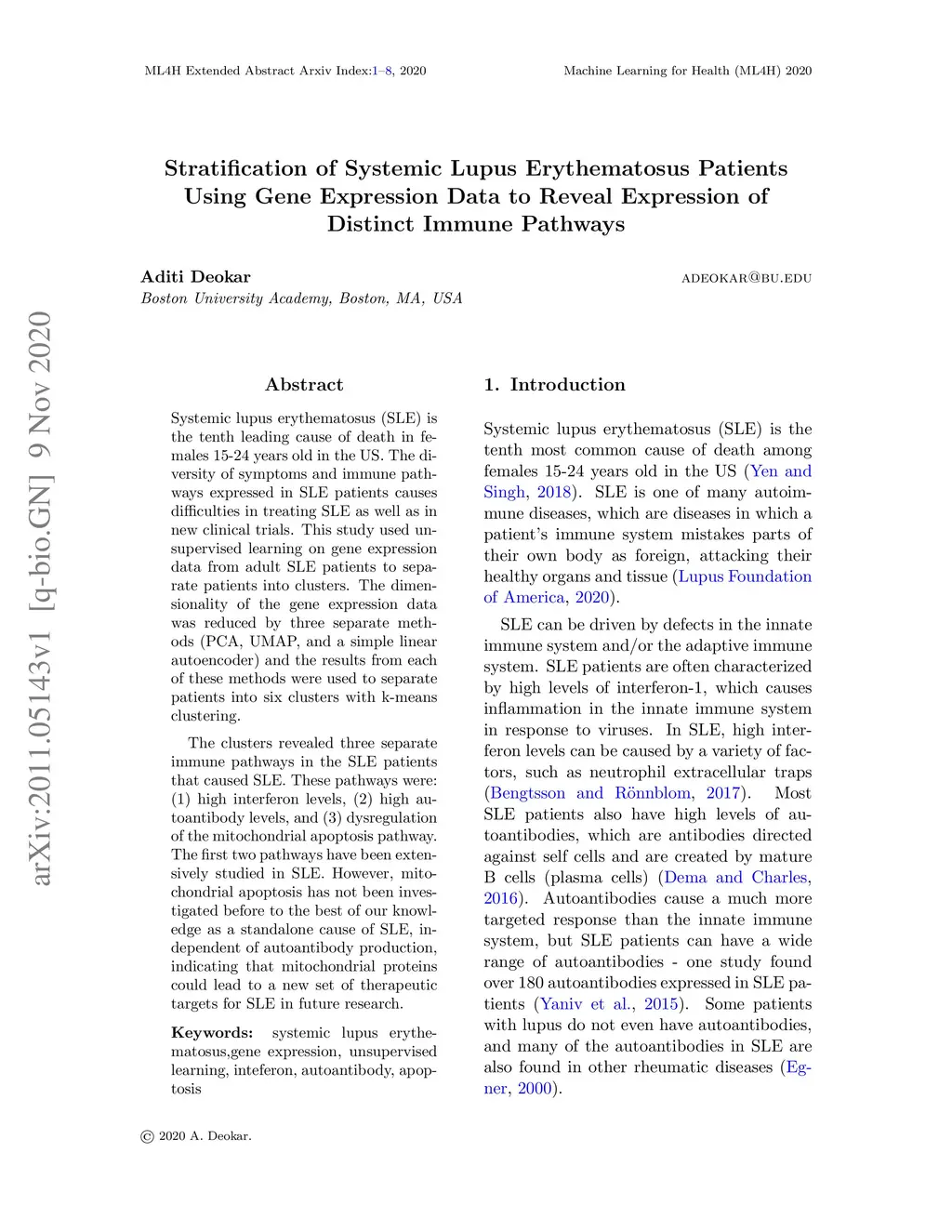 Systemic lupus erythematosus (SLE) is the tenth leading cause of death in females 15-24 years old in the US. The diversity of symptoms and immune pathways expressed in SLE patients causes difficulties in treating SLE as well as in new clinical trials. This study used unsupervised learning on gene expression data from adult SLE patients to separate patients into clusters. The dimensionality of the gene expression data was reduced by three separate methods (PCA, UMAP, and a simple linear autoencoder) and the results from each of these methods were used to separate patients into six clusters with k-means clustering. The clusters revealed three separate immune pathways in the SLE patients that caused SLE. These pathways were: (1) high interferon levels, (2) high autoantibody levels, and (3) dysregulation of the mitochondrial apoptosis pathway. The first two pathways have been extensively studied in SLE. However, mitochondrial apoptosis has not been investigated before to the best of our knowledge as a standalone cause of SLE, independent of autoantibody production, indicating that mitochondrial proteins could lead to a new set of therapeutic targets for SLE in future research.