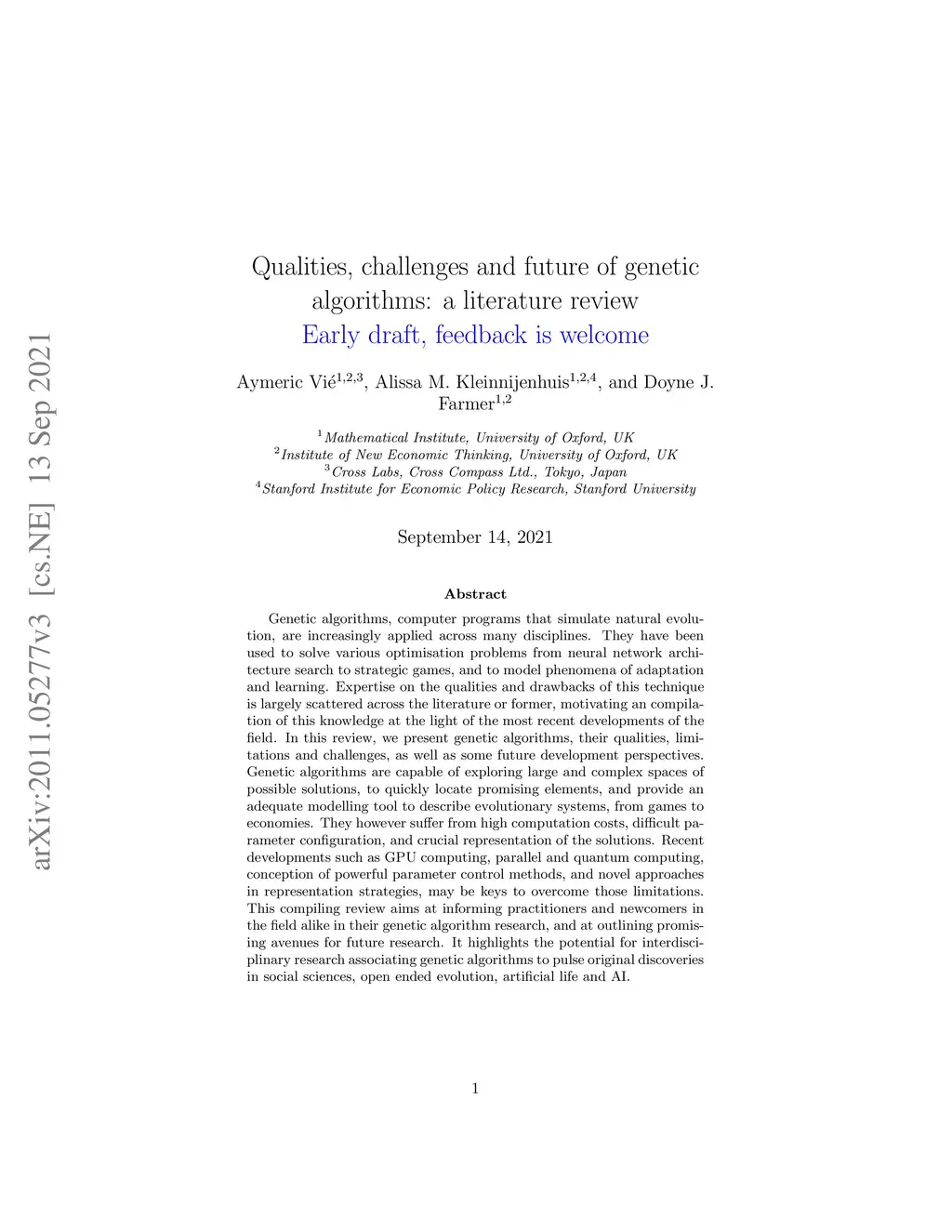 Genetic algorithms, computer programs that simulate natural evolution, are increasingly applied across many disciplines. They have been used to solve various optimisation problems from neural network architecture search to strategic games, and to model phenomena of adaptation and learning. Expertise on the qualities and drawbacks of this technique is largely scattered across the literature or former, motivating an compilation of this knowledge at the light of the most recent developments of the field. In this review, we present genetic algorithms, their qualities, limitations and challenges, as well as some future development perspectives. Genetic algorithms are capable of exploring large and complex spaces of possible solutions, to quickly locate promising elements, and provide an adequate modelling tool to describe evolutionary systems, from games to economies. They however suffer from high computation costs, difficult parameter configuration, and crucial representation of the solutions. Recent developments such as GPU, parallel and quantum computing, conception of powerful parameter control methods, and novel approaches in representation strategies, may be keys to overcome those limitations. This compiling review aims at informing practitioners and newcomers in the field alike in their genetic algorithm research, and at outlining promising avenues for future research. It highlights the potential for interdisciplinary research associating genetic algorithms to pulse original discoveries in social sciences, open ended evolution, artificial life and AI.