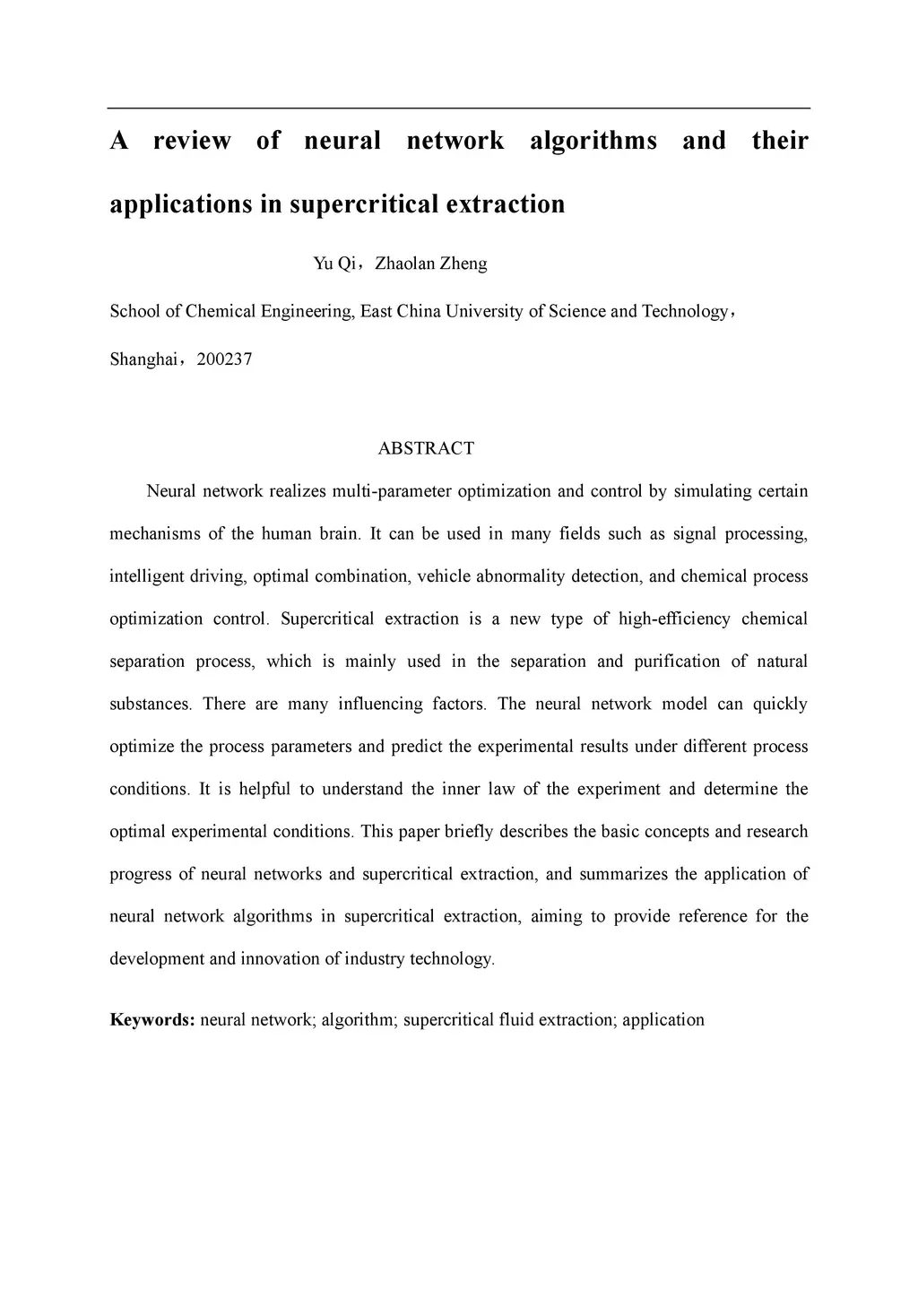 Neural network realizes multi-parameter optimization and control by simulating certain mechanisms of the human brain. It can be used in many fields such as signal processing, intelligent driving, optimal combination, vehicle abnormality detection, and chemical process optimization control. Supercritical extraction is a new type of high-efficiency chemical separation process, which is mainly used in the separation and purification of natural substances. There are many influencing factors. The neural network model can quickly optimize the process parameters and predict the experimental results under different process conditions. It is helpful to understand the inner law of the experiment and determine the optimal experimental conditions. This paper briefly describes the basic concepts and research progress of neural networks and supercritical extraction, and summarizes the application of neural network algorithms in supercritical extraction, aiming to provide reference for the development and innovation of industry technology.