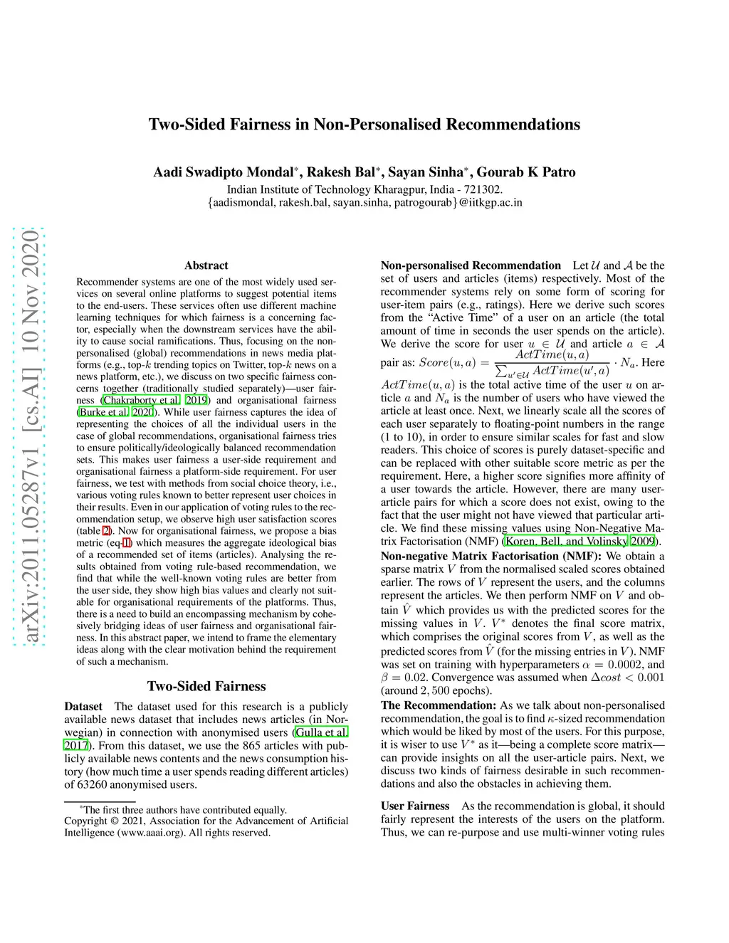 Recommender systems are one of the most widely used services on several online platforms to suggest potential items to the end-users. These services often use different machine learning techniques for which fairness is a concerning factor, especially when the downstream services have the ability to cause social ramifications. Thus, focusing on the non-personalised (global) recommendations in news media platforms (e.g., top-k trending topics on Twitter, top-k news on a news platform, etc.), we discuss on two specific fairness concerns together (traditionally studied separately)---user fairness and organisational fairness. While user fairness captures the idea of representing the choices of all the individual users in the case of global recommendations, organisational fairness tries to ensure politically/ideologically balanced recommendation sets. This makes user fairness a user-side requirement and organisational fairness a platform-side requirement. For user fairness, we test with methods from social choice theory, i.e., various voting rules known to better represent user choices in their results. Even in our application of voting rules to the recommendation setup, we observe high user satisfaction scores. Now for organisational fairness, we propose a bias metric which measures the aggregate ideological bias of a recommended set of items (articles). Analysing the results obtained from voting rule-based recommendation, we find that while the well-known voting rules are better from the user side, they show high bias values and clearly not suitable for organisational requirements of the platforms. Thus, there is a need to build an encompassing mechanism by cohesively bridging ideas of user fairness and organisational fairness. In this abstract paper, we intend to frame the elementary ideas along with the clear motivation behind the requirement of such a mechanism.