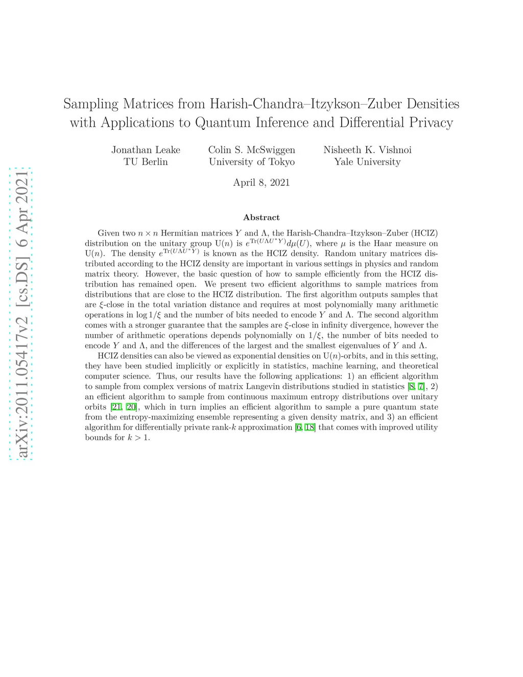 Given two Hermitian matrices and , the Harish-Chandra--Itzykson--Zuber (HCIZ) density on the unitary group is where is the Haar measure on . Random unitary matrices distributed according to the HCIZ density are important in various settings in physics and random matrix theory. However, the basic question of how to sample efficiently from the HCIZ density has remained open. The main contribution of this paper is an algorithm to sample a matrix from a distribution that is -close to the given HCIZ density and whose running time depends polylogarithmically on . Interestingly, HCIZ densities can also be viewed as exponential densities on -orbits, and in this setting, they have been widely studied. Thus, our result has several direct applications, including polynomial-time algorithms 1) to sample from matrix Langevin distributions studied in statistics, 2) to sample from continuous maximum entropy distributions with applications to quantum inference, and 3) for differentially private low-rank approximation. The key obstacle in sampling from an HCIZ density is that the domain is an algebraic manifold and the entries of the sample matrix are highly correlated. To overcome this, we consider a mapping that sends each Hermitian matrix to a natural ordering of the eigenvalues of all leading principal minors of . The image of each -orbit under this map is a convex polytope, and the mapping reveals a recursive structure of -orbits. Subsequently, we develop efficiently computable determinantal expressions for densities that arise in the intermediate steps of sampling from the polytope. Our proof-technique applies to other compact Lie groups and can be viewed as extending the widely studied notion of self-reducibility.