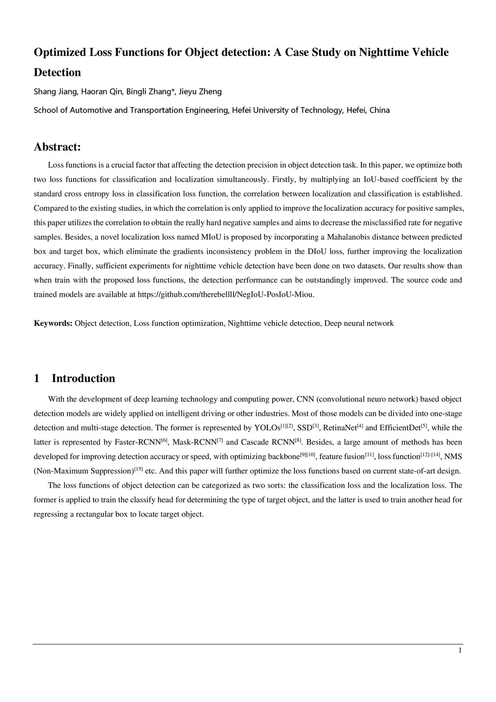 Loss functions is a crucial factor that affecting the detection precision in object detection task. In this paper, we optimize both two loss functions for classification and localization simultaneously. Firstly, by multiplying an IoU-based coefficient by the standard cross entropy loss in classification loss function, the correlation between localization and classification is established. Compared to the existing studies, in which the correlation is only applied to improve the localization accuracy for positive samples, this paper utilizes the correlation to obtain the really hard negative samples and aims to decrease the misclassified rate for negative samples. Besides, a novel localization loss named MIoU is proposed by incorporating a Mahalanobis distance between predicted box and target box, which eliminate the gradients inconsistency problem in the DIoU loss, further improving the localization accuracy. Finally, sufficient experiments for nighttime vehicle detection have been done on two datasets. Our results show than when train with the proposed loss functions, the detection performance can be outstandingly improved. The source code and trained models are available at https://github.com/therebellll/NegIoU-PosIoU-Miou.