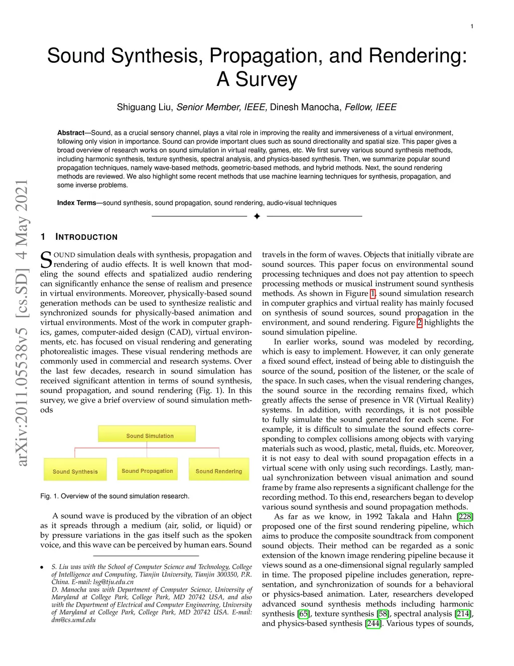 Sound, as a crucial sensory channel, plays a vital role in improving the reality and immersiveness of a virtual environment, following only vision in importance. Sound can provide important clues such as sound directionality and spatial size. This paper gives a broad overview of research works on sound simulation in virtual reality, games, multimedia, computer-aided design. We first survey various sound synthesis methods, including harmonic synthesis, texture synthesis, spectral analysis, and physics-based synthesis. Then, we summarize popular sound propagation techniques, namely wave-based methods, geometric-based methods, and hybrid methods. Next, the sound rendering methods are reviewed. We further demonstrate the latest deep learning based sound simulation approaches. Finally, we point to some future directions of this field. To the best of our knowledge, this is the first attempt to provide a comprehensive summary of sound research in the field of computer graphics.