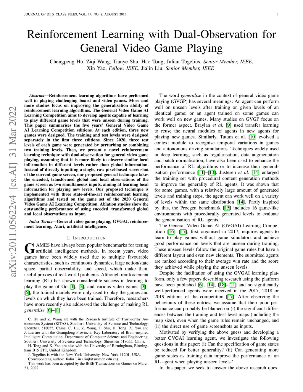 Reinforcement learning algorithms have performed well in playing challenging board and video games. More and more studies focus on improving the generalisation ability of reinforcement learning algorithms. The General Video Game AI Learning Competition aims to develop agents capable of learning to play different game levels that were unseen during training. This paper summarises the five years' General Video Game AI Learning Competition editions. At each edition, three new games were designed. The training and test levels were designed separately in the first three editions. Since 2020, three test levels of each game were generated by perturbing or combining two training levels. Then, we present a novel reinforcement learning technique with dual-observation for general video game playing, assuming that it is more likely to observe similar local information in different levels rather than global information. Instead of directly inputting a single, raw pixel-based screenshot of the current game screen, our proposed general technique takes the encoded, transformed global and local observations of the game screen as two simultaneous inputs, aiming at learning local information for playing new levels. Our proposed technique is implemented with three state-of-the-art reinforcement learning algorithms and tested on the game set of the 2020 General Video Game AI Learning Competition. Ablation studies show the outstanding performance of using encoded, transformed global and local observations as input.