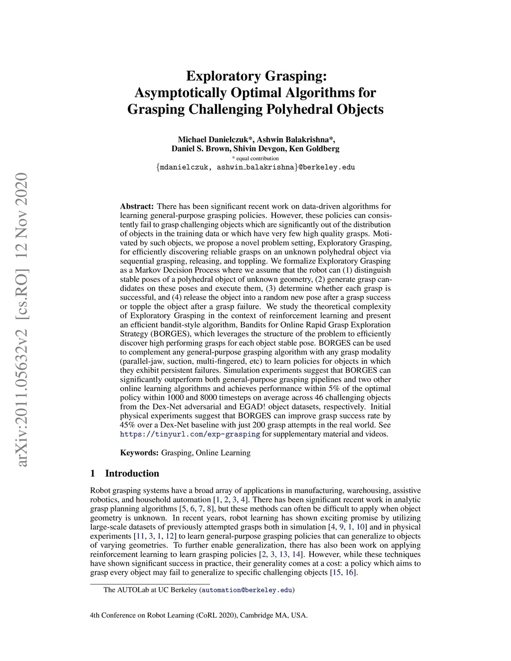 Exploratory Grasping: Asymptotically Optimal Algorithms for Grasping