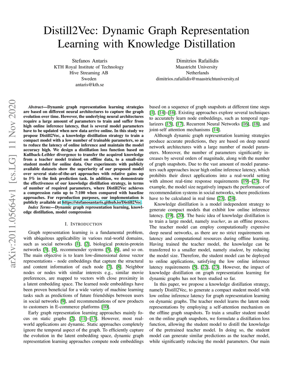 Distill2Vec: Dynamic Graph Representation Learning with Knowledge