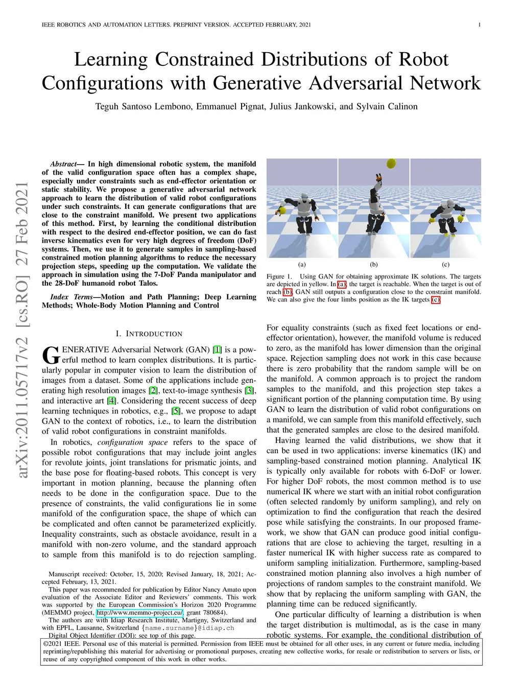 In high dimensional robotic system, the manifold of the valid configuration space often has a complex shape, especially under constraints such as end-effector orientation or static stability. We propose a generative adversarial network approach to learn the distribution of valid robot configurations under such constraints. It can generate configurations that are close to the constraint manifold. We present two applications of this method. First, by learning the conditional distribution with respect to the desired end-effector position, we can do fast inverse kinematics even for very high degrees of freedom (DoF) systems. Then, we use it to generate samples in sampling-based constrained motion planning algorithms to reduce the necessary projection steps, speeding up the computation. We validate the approach in simulation using the 7-DoF Panda manipulator and the 28-DoF humanoid robot Talos.