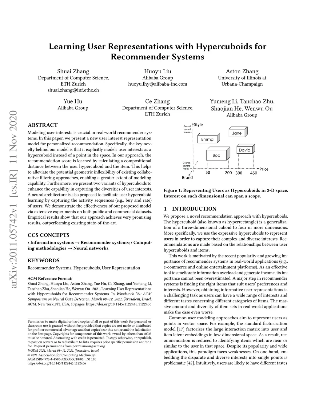Modeling user interests is crucial in real-world recommender systems. In this paper, we present a new user interest representation model for personalized recommendation. Specifically, the key novelty behind our model is that it explicitly models user interests as a hypercuboid instead of a point in the space. In our approach, the recommendation score is learned by calculating a compositional distance between the user hypercuboid and the item. This helps to alleviate the potential geometric inflexibility of existing collaborative filtering approaches, enabling a greater extent of modeling capability. Furthermore, we present two variants of hypercuboids to enhance the capability in capturing the diversities of user interests. A neural architecture is also proposed to facilitate user hypercuboid learning by capturing the activity sequences (e.g., buy and rate) of users. We demonstrate the effectiveness of our proposed model via extensive experiments on both public and commercial datasets. Empirical results show that our approach achieves very promising results, outperforming existing state-of-the-art.