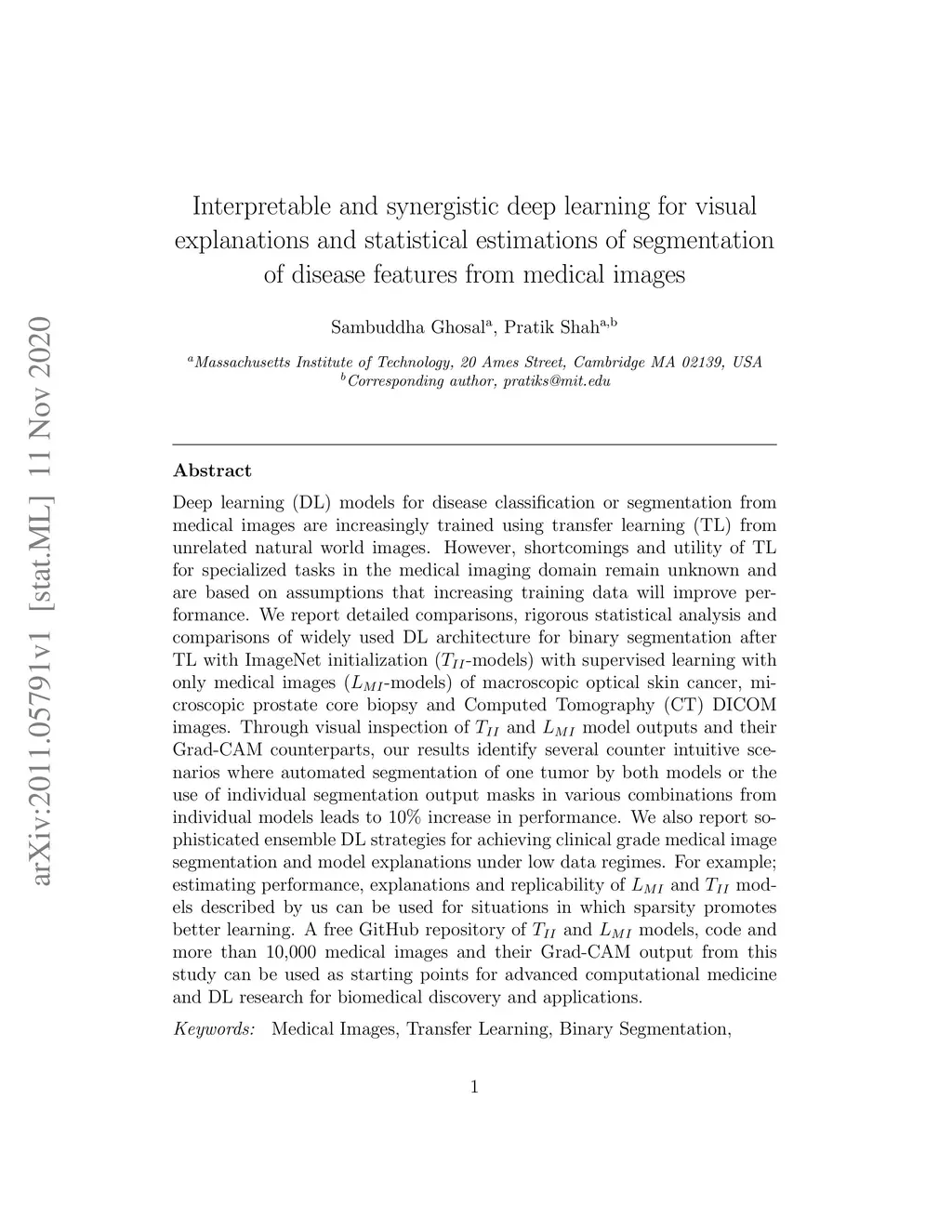 Deep learning (DL) models for disease classification or segmentation from medical images are increasingly trained using transfer learning (TL) from unrelated natural world images. However, shortcomings and utility of TL for specialized tasks in the medical imaging domain remain unknown and are based on assumptions that increasing training data will improve performance. We report detailed comparisons, rigorous statistical analysis and comparisons of widely used DL architecture for binary segmentation after TL with ImageNet initialization (TII-models) with supervised learning with only medical images(LMI-models) of macroscopic optical skin cancer, microscopic prostate core biopsy and Computed Tomography (CT) DICOM images. Through visual inspection of TII and LMI model outputs and their Grad-CAM counterparts, our results identify several counter intuitive scenarios where automated segmentation of one tumor by both models or the use of individual segmentation output masks in various combinations from individual models leads to 10% increase in performance. We also report sophisticated ensemble DL strategies for achieving clinical grade medical image segmentation and model explanations under low data regimes. For example; estimating performance, explanations and replicability of LMI and TII models described by us can be used for situations in which sparsity promotes better learning. A free GitHub repository of TII and LMI models, code and more than 10,000 medical images and their Grad-CAM output from this study can be used as starting points for advanced computational medicine and DL research for biomedical discovery and applications.
