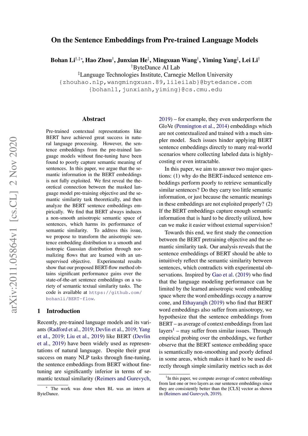 Pre-trained contextual representations like BERT have achieved great success in natural language processing. However, the sentence embeddings from the pre-trained language models without fine-tuning have been found to poorly capture semantic meaning of sentences. In this paper, we argue that the semantic information in the BERT embeddings is not fully exploited. We first reveal the theoretical connection between the masked language model pre-training objective and the semantic similarity task theoretically, and then analyze the BERT sentence embeddings empirically. We find that BERT always induces a non-smooth anisotropic semantic space of sentences, which harms its performance of semantic similarity. To address this issue, we propose to transform the anisotropic sentence embedding distribution to a smooth and isotropic Gaussian distribution through normalizing flows that are learned with an unsupervised objective. Experimental results show that our proposed BERT-flow method obtains significant performance gains over the state-of-the-art sentence embeddings on a variety of semantic textual similarity tasks. The code is available at https://github.com/bohanli/BERT-flow.