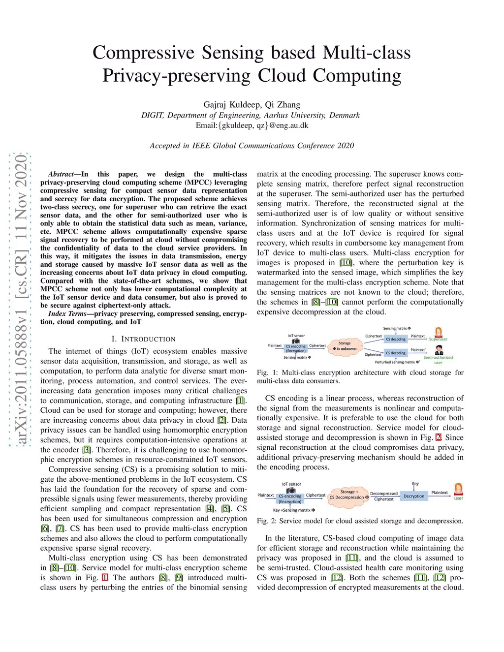 In this paper, we design the multi-class privacypreserving cloud computing scheme (MPCC) leveraging compressive sensing for compact sensor data representation and secrecy for data encryption. The proposed scheme achieves two-class secrecy, one for superuser who can retrieve the exact sensor data, and the other for semi-authorized user who is only able to obtain the statistical data such as mean, variance, etc. MPCC scheme allows computationally expensive sparse signal recovery to be performed at cloud without compromising the confidentiality of data to the cloud service providers. In this way, it mitigates the issues in data transmission, energy and storage caused by massive IoT sensor data as well as the increasing concerns about IoT data privacy in cloud computing. Compared with the state-of-the-art schemes, we show that MPCC scheme not only has lower computational complexity at the IoT sensor device and data consumer, but also is proved to be secure against ciphertext-only attack.