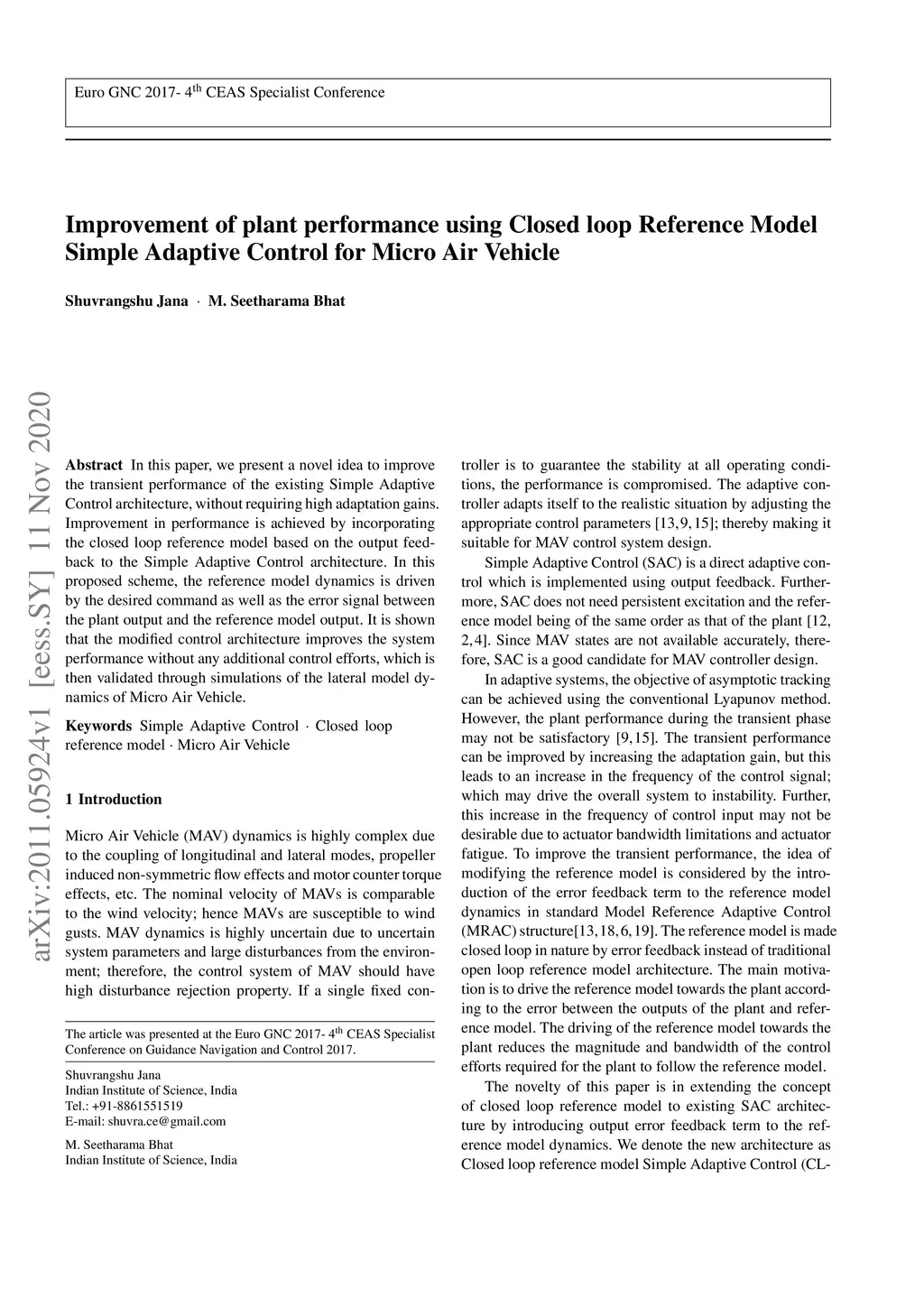 Simple Adaptive Control for Micro Air Vehicle